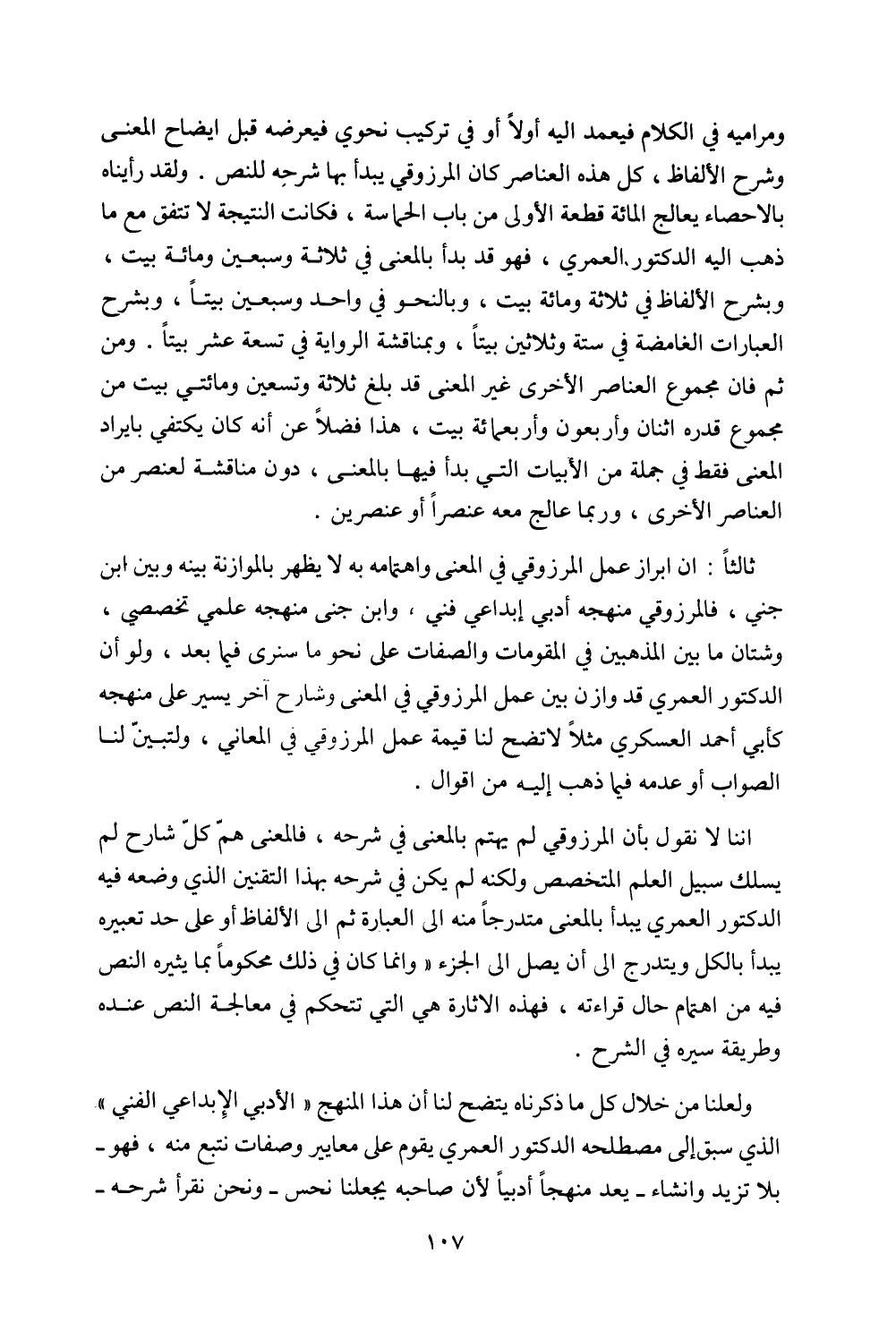 ثالثًا: إن إبراز عمل المرزوقي في المعني واهتمامه به لا يظهر بالموازنة بينه وبين ابن جني، فالمرزوقي منهجه أدبي إبداعي فني، وابن جني منهجه علمي تخصصي، وشتان ما بين المذهبين في المقومات والصفات على نحو ما سنرى فيما بعد، ولو أن الدكتور العمري قد وازن بين عمل المرزوقي المعني وشارح آخر يسير على منهجه كأبي أحمد العسكري مثًلا لاتضح لنا قيمة عمل المرزوقي في المعاني، ولتبين لنا الصواب أو عدمه فيما ذهب إليه من أقوال.