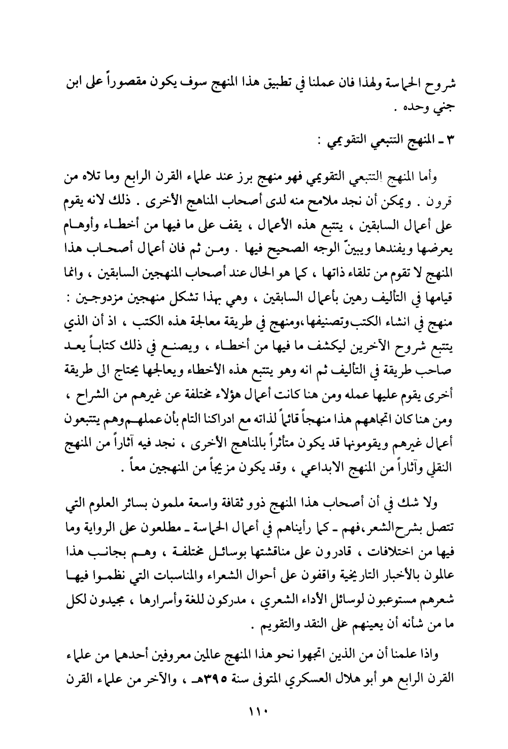 شروح الحماسة ولهذا فإن عملنا في تطبيق هذا المنهج سوف يكون مقصوراً على ابن جني وحده.