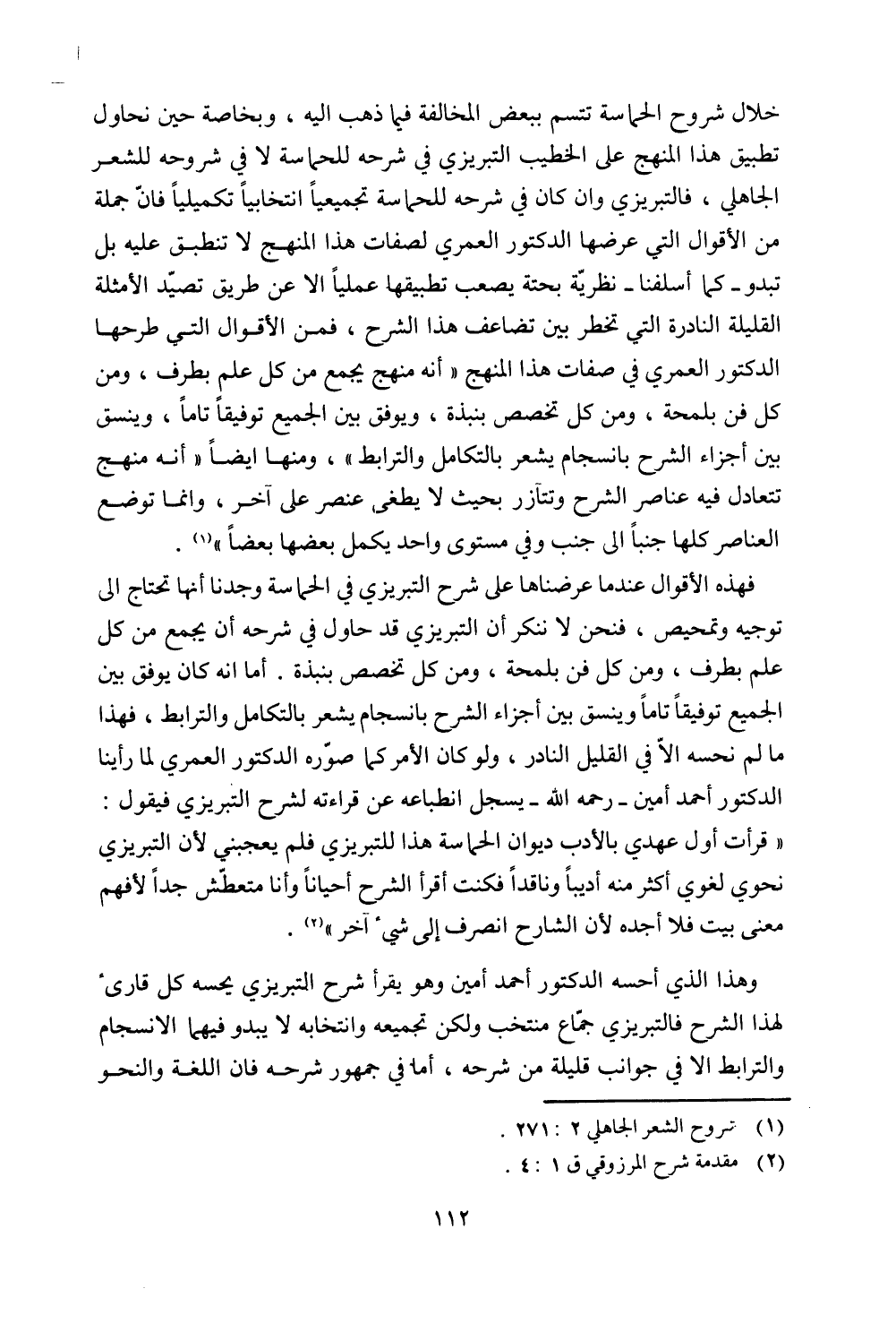 خلال شروح الحماسة تتسم ببعض المخالفة فيما ذهب إليه، وبخاصة حين نحاول تطبيق هذا المنهج على الخطيب التبريزي في شرحه للحماسة لا في شروحه للشعر الجاهلي، فالتبريزي وان كان في شرحه للحماسة تجميعياً انتخابياً تكميلياً فان جملة من الأقوال التي عرضها الدكتور العمري لصفات هذا المنهج لا تنطبق عليه بل تبدو- كما أسلفنا- نظرية بحته يصعب تطبيقها عملياً إلا عن طريق تصيد الأمثلة القليلة النادرة التي تخطر بين تضاعف هذا الشرح، فمن الأقوال التي طرحها الدكتور العمري في صفات هذا المنهج" أنه منهج يجمع من كل علم بطرف، ومن كل فن بلمحة، ومن كل تخصص بنبذة، ويوفق بين الجميع توفيقاً تامًا، وينسق بين أجزاء الشرح بانسجام يشعر بالتكامل والترابط" ومنها أيضًا "أنه منهج تتعادل فيه عناصر الشرح وتتآزر بحيث لا يطغى عنصر على آخر، وإنما توضع العناصر كلها جنبًا إلى جنب وفي مستوى واحد يكمل بعضها بعضًا".