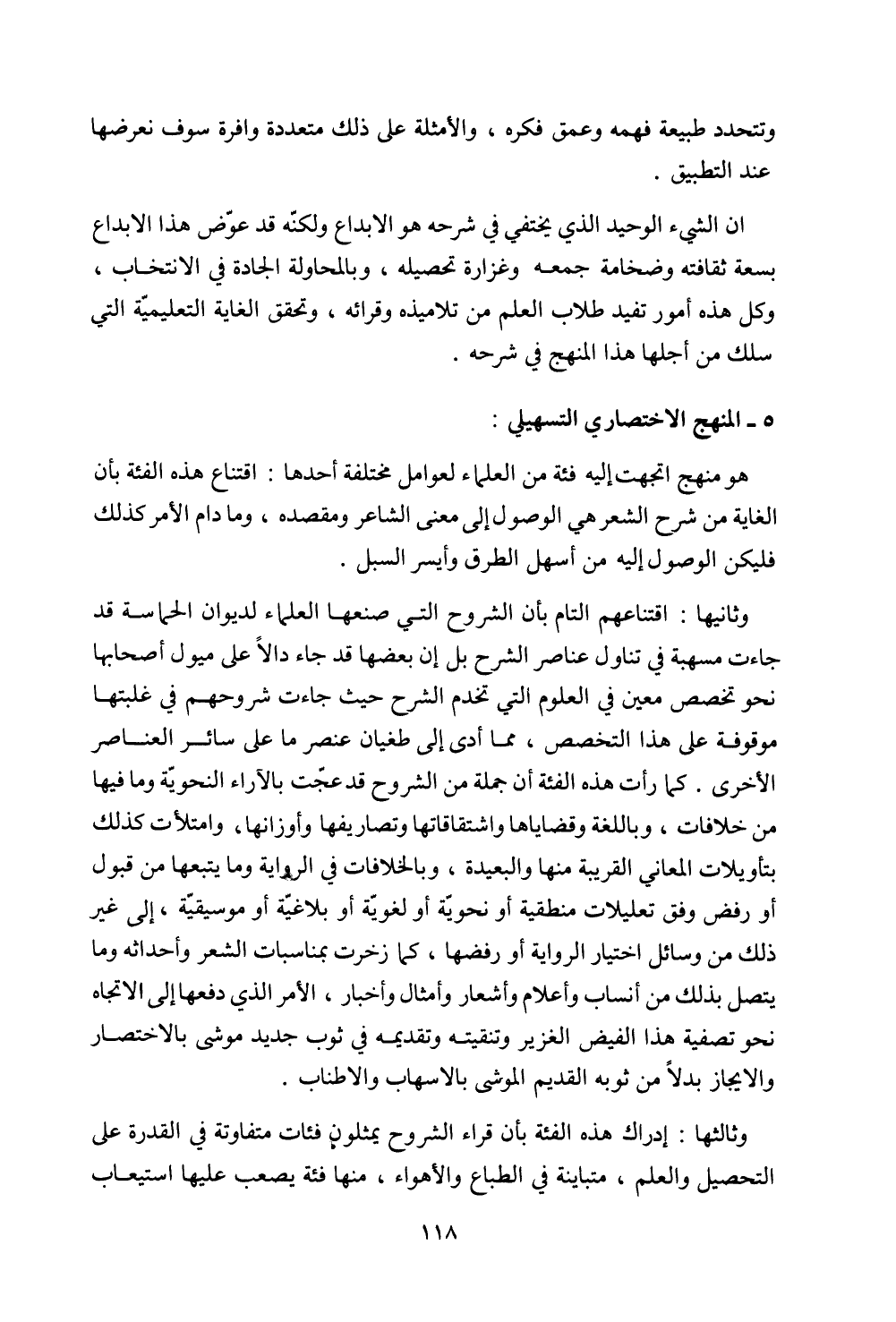هو منهج اتجهت إليه فئة من العلماء لعوامل مختلفة أحدها: اقتناع هذه الفئة بأن الغاية من شرح الشعر هي الوصول إلى معني الشاعر ومقصده، وما دام الأمر ذلك فليكن الوصول إليه من أسهل الطرق وأيسر السبل.