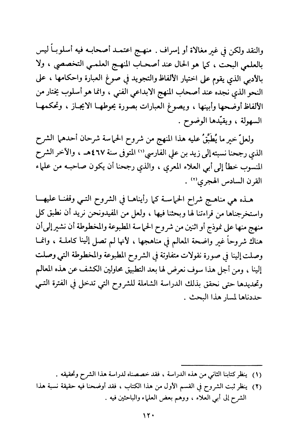 ولعل خير ما يُطَبَّقُ عليه هذا المنهج من شروح الحماسة شرحان أحدهما الشرح الذي رجحنا نسبته إلى زيد بن على الفارسي المتوفى سنة 467 هـ، والآخر الشرح المنسوب خطأ إلى أبي العلاء المعري، والذي رجحنا أن يكون صاحبه من علماء القرن السادس الهجري.
