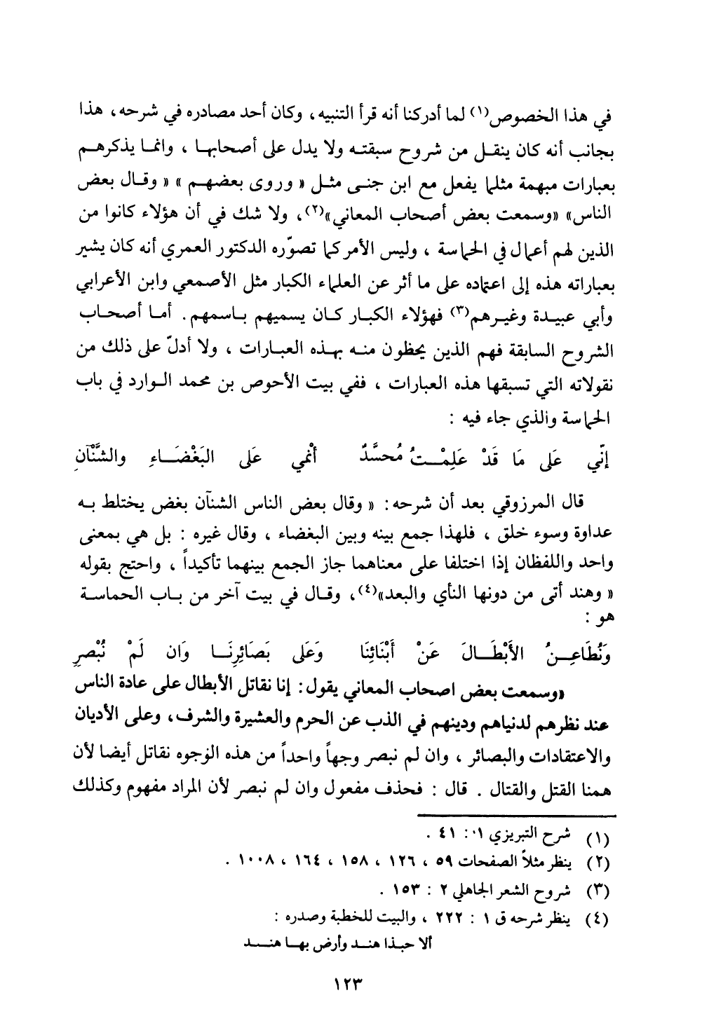 في هذا الخصوص لما أدركنا أنه قرأ التنبيه، وكان أحد مصادره في شرحه، هذا بجانب أنه كان ينقل من شروح سبقته ولا يدل على أصحابها، وإنما يذكرهم بعبارات مبهمة مثلما يفعل مع ابن جني مثل"وروي بعضهم" "وقال بعض الناس" وسمعت بعض أصحاب المعاني"، ولا شك في أن هؤلاء كانوا من الذين لهم أعمال في الحماسة، وليس الأمر كما تصوره الدكتور العمري أنه كان يشير بعباراته هذه إلى اعتماده على ما أثر عن العلماء الكبار مثل الأصمعي وابن الأعرابي وأبي عبيدة وغيرهم فهؤلاء الكبار كان يسميهم باسمهم. أما أصحاب الشروح السابقة فهم الذين يحظون منه بهذه العبارات، ولا أدل على ذلك من نقولاته التي تسبقها هذه العبارات، ففي بيت الأحوص بن محمد الوارد في باب الحماسة والذي جاء فيه: