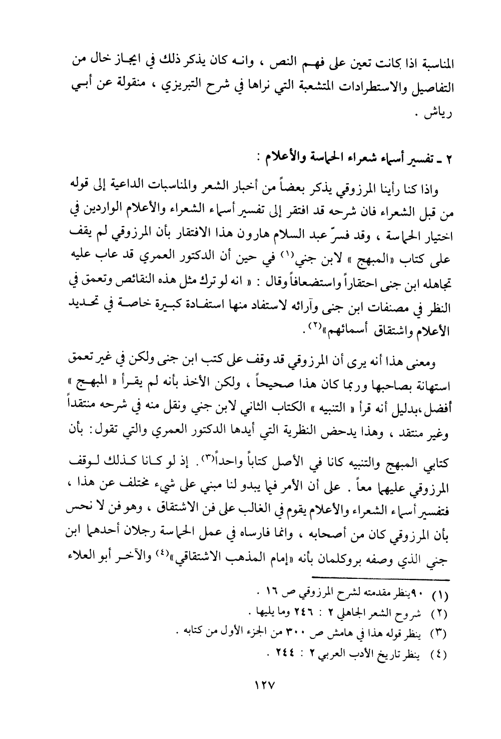 ومعني هذا أنه يرى أن المرزوقي قد وقف على كتب ابن جني ولكن في غير تعمق استهانة بصاحبها وربما كان هذا صحيحًا، ولكن الأخذ بأنه لم يقرأ"المبهج" أفضل، بدليل أنه قرأ"التنبيه" الكتاب الثاني لابن جني ونقل منه في شرحه منتقداً وغير منتقد، وهذا يدحض النظرية التي أيدها الدكتور العمري والتي تقول: بأن كتابي المبهج والتنبيه كان في الأصل كتابًا واحدًا. إذ لو كانا كذلك لوقف المرزوقي عليهما معًا. على أن الأمر فيما يبدو لنا مبني على شيء مختلف عن هذا، فتفسير أسماء الشعراء والأعلام يقوم في الغالب على فن الاشتقاق، وهو فن لا نحس بأن المرزوقي كان من أصحابه، وإنما فارساه في عمل الحماسة رجلان أحدهما ابن جني الذي وصفه بروكلمان بأنه"إمام المذهب الاستقاقي" والآخر أبو العلاء