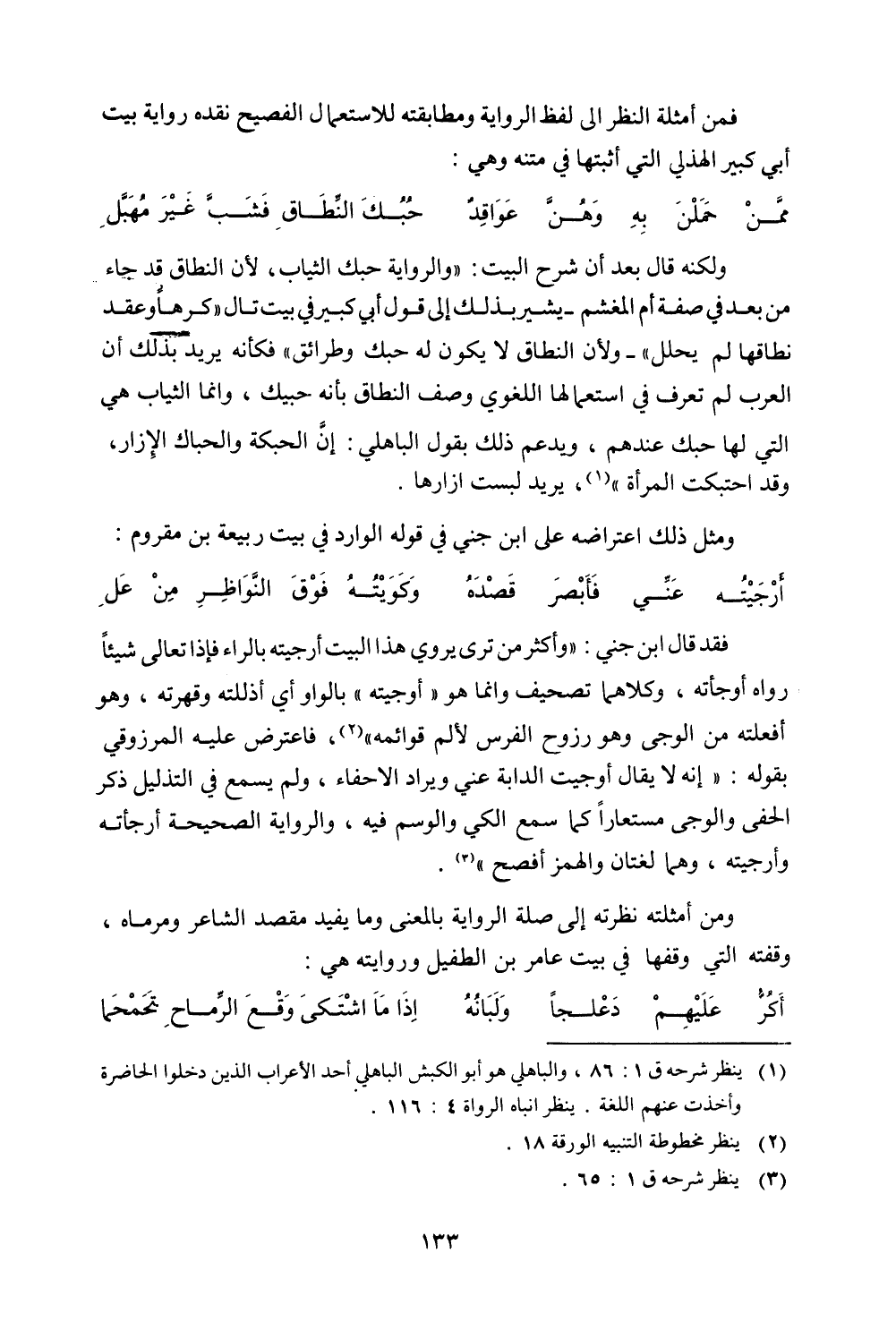 فمن أمثلة النظر إلى لفظ الرواية ومطابقته للاستعمال الفصيح نقده رواية بيت أبي كبير الهذلي التي أثبتها في متنه وهي: