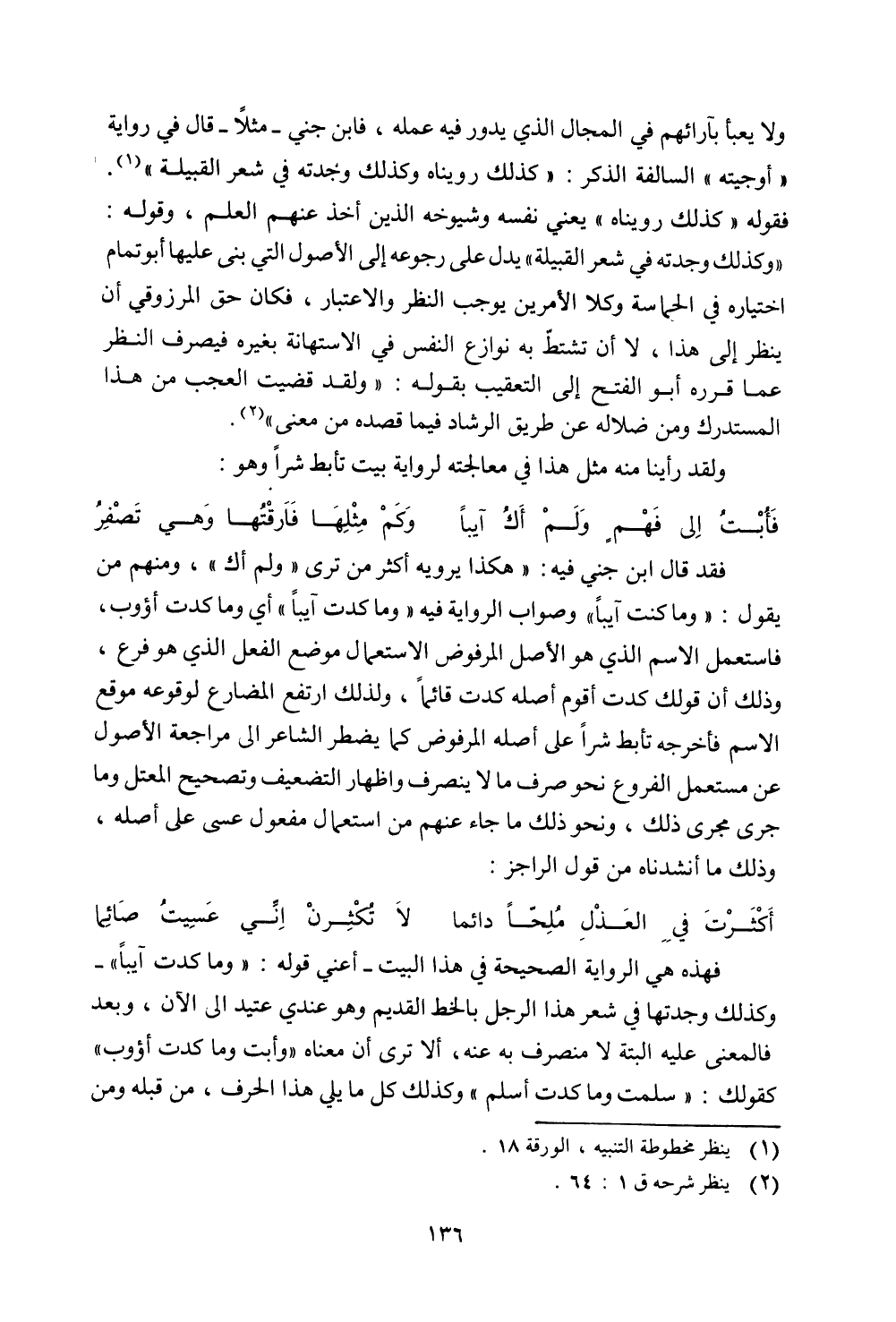 ولا يعبأ بآرائهم في المجال الذي يدور فيه عمله، فابن جني- مثلاً- قال في رواية "أوجيته" السالفة الذكر: "كذلك رويناه وكذلك وجدته في شعر القبيلة". فقوله "كذلك رويناه" يعني نفسه وشيوخه الذين اخذ عنهم العلم، وقوله: " وكذلك وجدته في شعر القبيلة" يدل على رجوعه إلى الأصول التي بني عليها أبو تمام اختياره في الحماسة وكلا الأمرين يوجب النظر والاعتبار، فكان حق المرزوقي ان ينظر إلى هذا، لا أن تشتط به نوازع النفس في الاستهانة بغيره فيصرف النظر عما قرره أبو الفتح إلى التعقيب بقوله" ولقد قضيت العجب من هذا المستدرك ومن ضلاله عن طريق الرشاد فيما قصده من معني".