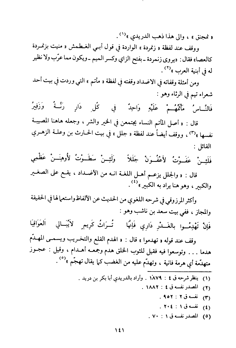 ووقف عند لفظه" زنمرده" الواردة في قول أبي الغطمش" منيت بزنمردة كالعصا" فقال: "يروى زنمردة - بفتح الزاي وكسر الميم- ويكون مما عرّب ولا نظير له في أبنية العرب".