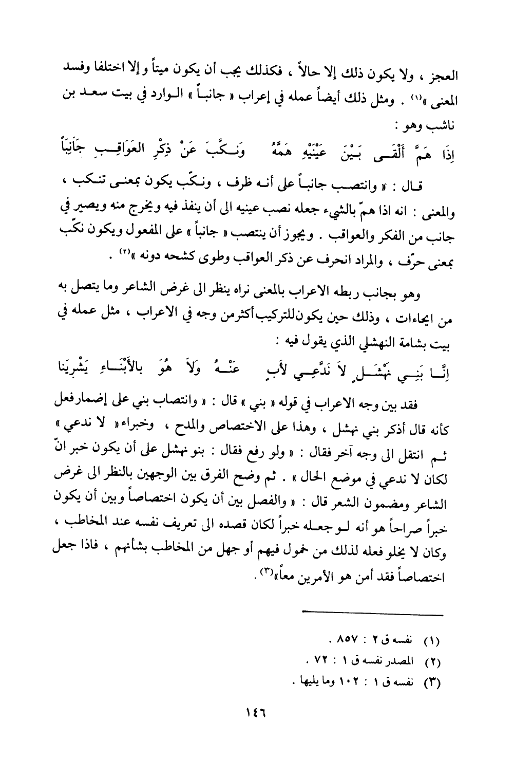 فقد بين وجه الإعراب في قوله" بني" قال: " وانتصاب بني على إضمار فعل كأنه قال أذكر بني نهل، وهذا على الاختصاص والمدح، وخبراء"لا ندعي" ثم انتقل إلى وجه آخر فقال: " ولو رفع فقال: بنهو نهشل على أن يكون خبر أن لكان لا ندعي في موضع الحال" ثم وضح الفرق بين الوجهين بالنظر إلى غرض الشاعر ومضمون الشعر قال: "والفصل بين أن يكون اختصاصًا وبين أن يكون خبرًا صراحًا هو أنه لو جعله خبرًا لكان قصده إلى تعريف نفسه عند المخاطب، وكان لا يخلو فعله لذلك من خمول أو جهل من المخاطب بشأنهم، فإذا جعل اختصاصًا فقد أمن هو الأمرين معًا".