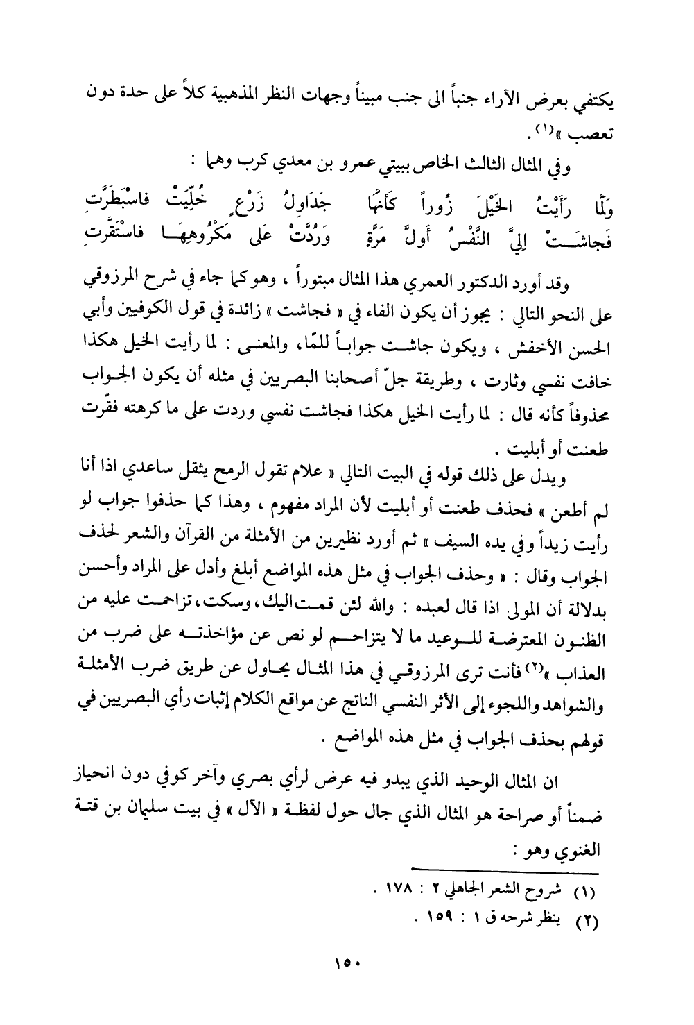 وقد أورد الدكتور العمري هذا المثال مبتورًا, وهو كما جاء في شرح المرزوقي على النحو التالي: يجوز أن يكون الفاء في ((فجاشت)) زائدة في قول الكوفيين وأبي الحسن الأخفش, ويكون جاشت جوابًا للما, والمعنى: لما رأيت الخيل هكذا خافت نفسي وثارت, وطريقة جل أصحابنا البصريين في مثله أن يكون الجواب محذوفا كأنه قال: لما رأيت الخيل هكذا فجاشت نفسي وردت على ما كرهته فقرت طعنت أو أبليت.