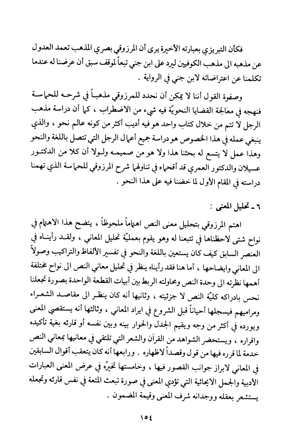 وصفوة القول أننا لا يمكن أن نحدد للمرزوقي مذهبًا في شرحه للحماسة فنهجه في معالجة القضايا النحوية فيه شيء من الاضطراب, كما أن دراسة مذهب الرجل لا تتم من خلال كتاب واحد فيه أديب أكثر من كونه عالم نحو, والذي ينبغي عمله في هذا الخصوص هو دراسة جميع أعمال الرجل التي تتصل باللغة والنحو وهذا عمل لا يتسع له بحثنا هذا ولا هو من صميمه ولولا أن كلا من الدكتور عسيلان والدكتور العمري قد أقحماه في تناولهما شرح المرزوقي للحماسة الذي تهمنا دراسته في المقام الأول لما خضنا فيه على النحو.