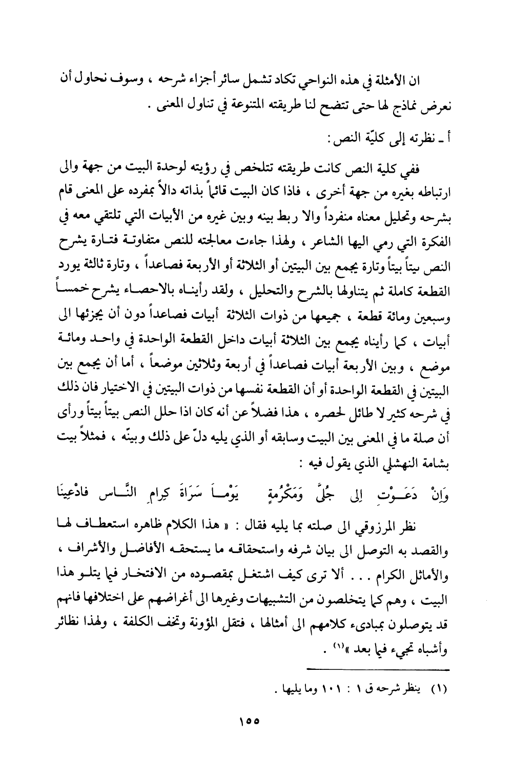ففي كلية النص كانت طريقته تتلخص في رؤيته لوحدة البيت من جهة وإلى ارتباطه بغيره من جهة أخرى, فإذا كان البيت قائمًا بذاته دالًا بمفرده على المعنى قام بشرحه وتحليل معناه منفردًا وإلا ربط بينه وبين غيره من الأبيات التي تلتقي معه في الفكرة التي رمي إليها الشاعر, ولهذا جاءت معالجته للنص متفاوتة فتارة يشرح النص بيتًا بيتًا وتارة يجمع بين البيتين أو الثلاثة أو الأربعة فصاعدًا, وتارة ثالثة يورد القطعة كاملة ثم يتناولها بالشرح والتحليل, ولقد رأيناه بالإحصاء يشرح خمسًا سوبعين ومائة قطعة, جميعها من ذوات الثلاثة أبيات فصاعدًا دون أن يجزئها إلى أبيات, كما رأيناه يجمع بين الثلاثة أبيات داخل القطعة الواحدة في واحد ومائة موضع, وبين الأربعة أبيات فصاعدًا في أربعة وثلاثين موضعًا, أما أن يجمع بين البيتين في القطعة الواحدة أو أن القطعة نفسها من ذوات البيتين في الاختيار فإن ذلك في شرحه كثير لا طائل لحصره, هذا فضلًا عن أنه كان إذا حلل النص بيتًا بيتًا ورأى أن صلة ما في المعنى بين البيت وسابقه أو الذي يليه دل ذلك وبينه, فمثلًا بيت بشامة النهشلي الذي يقول فيه: