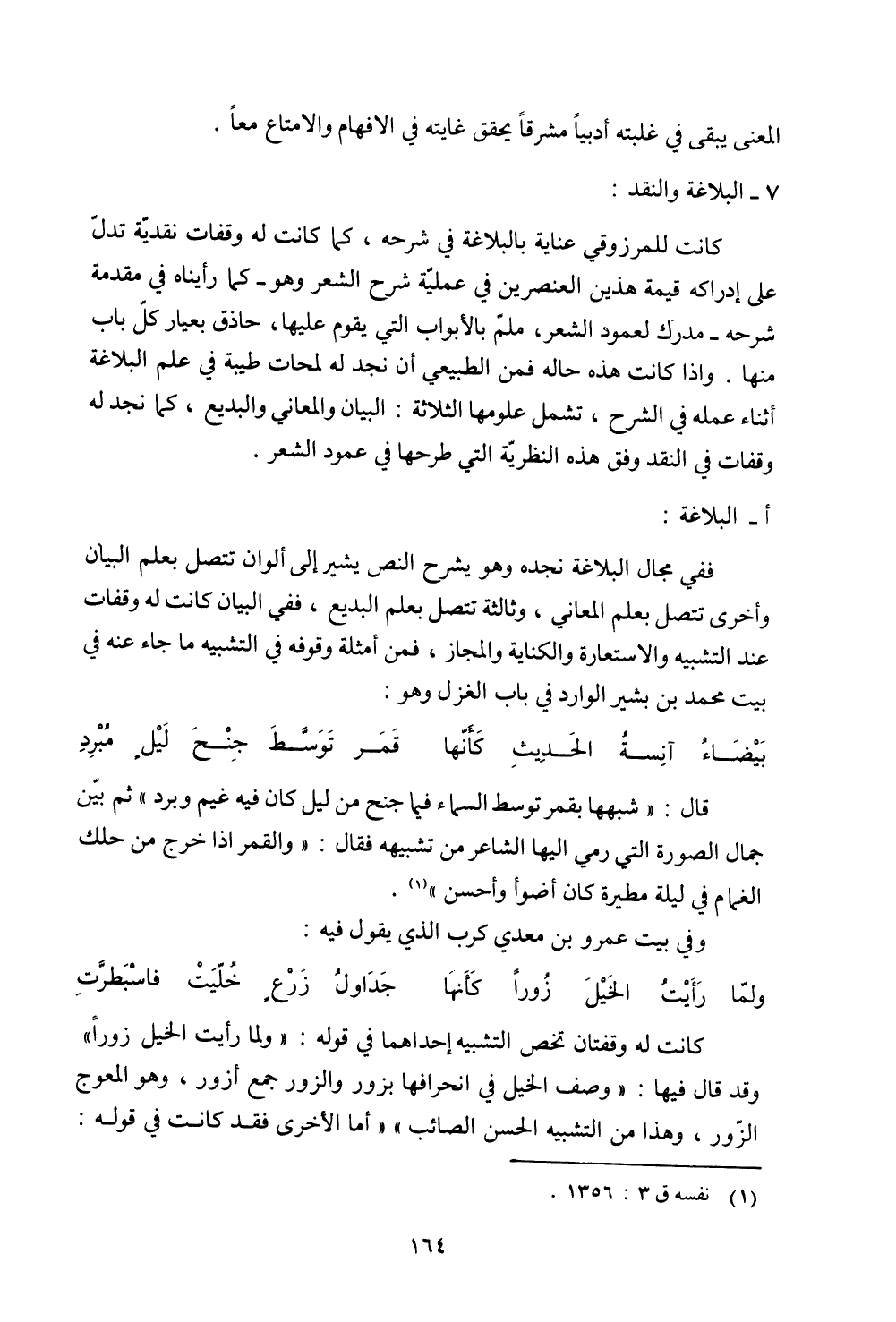 كانت للمرزوقي عناية بالبلاغة في شرحه, كما كانت له وقات نقدية تدل على إدراكه قيمة هذين العنصرين في عملية شرح الشعر وهو- كما رأيناه في مقدمة شرحه- مدرك لعمود الشعر, ملم بالأبواب التي يقوم عليها, حاذق بعيار كل باب منها. وإذا كانت هذه حالة فمن الطبيعي أن نجد له لمحات طيبة في علم البلاغة أثناء عملية في الشرح, تشمل علومها الثلاثة: البيان والمعاني والبديع, كما نجد له وقفات في النقد وفق هذه النظرية التي طرحها في عمود الشعر.