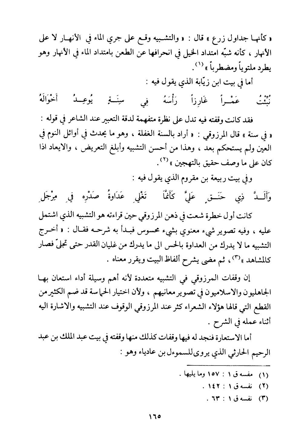 أما الاستعارة فنجد له فيها وقفات كذلك منها وقفته في بيت عبد الملك بن عبد الرحيم الحارثي الذي يروى للسموءل بن عادياء وهو: