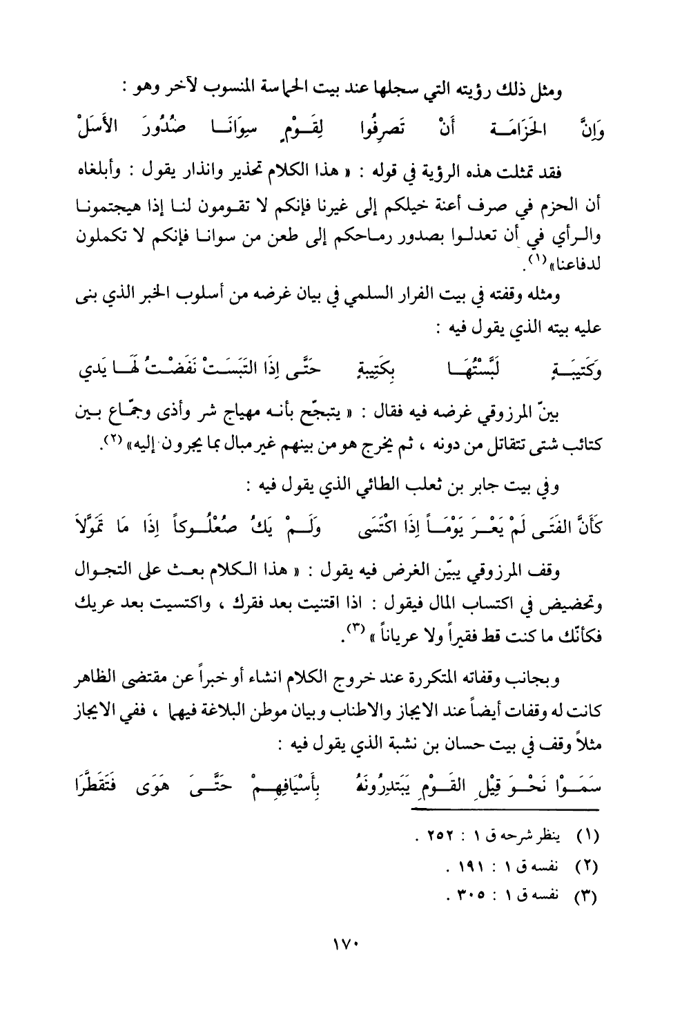 ومثل ذلك رؤيته التي سجلها عند بيت الحماسة المنسوب لآخر وهو: