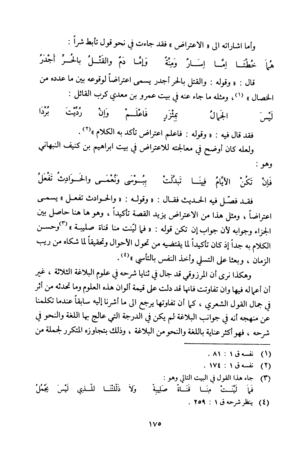 فقد فصل فيه الحديث فقال: ((وقوله: ((والحوادث تفعل)) يسمى اعتراضًا، ومثل هذا من الاعتراض يزيد القصة تأكيدًا، وهو ها هنا حاصل بين الجزاء وجوابه لأن جواب إن تكن قوله: ((فما لينت منا قناة صليبة)) وحسن الكلام به جدًا إذ كان تأكيدًا لما يقتضيه من تحول الأحوال وتحقيقًا لما شكاه من ريب الزمان، وبعثا على التسلي وأخذ النفس بالتأسي)).