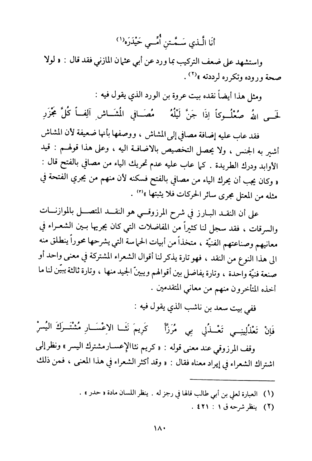 على أن النقد البارز في شرح المرزوقي هو النقد المتصل بالموازنات والسرقات، فقد سجل لنا كثيرًا من المفاضلات التي كان يجريها بين الشعراء في معانيهم وصناعتهم الفنية، متخذًا من أبيات الحماسة التي يشرحها محورًا ينطلق منه إلى هذا النوع من النقد، فهو تارة يذكر لنا أقوال الشعراء المشتركة في معنى واحد أو صنعة فنية واحدة، وتارة يفاضل بين أقوالهم ويبين الجيد منها، وتارة ثالثة يبين لنا ما أخذه المتأخرون منهم من معاني المتقدمين