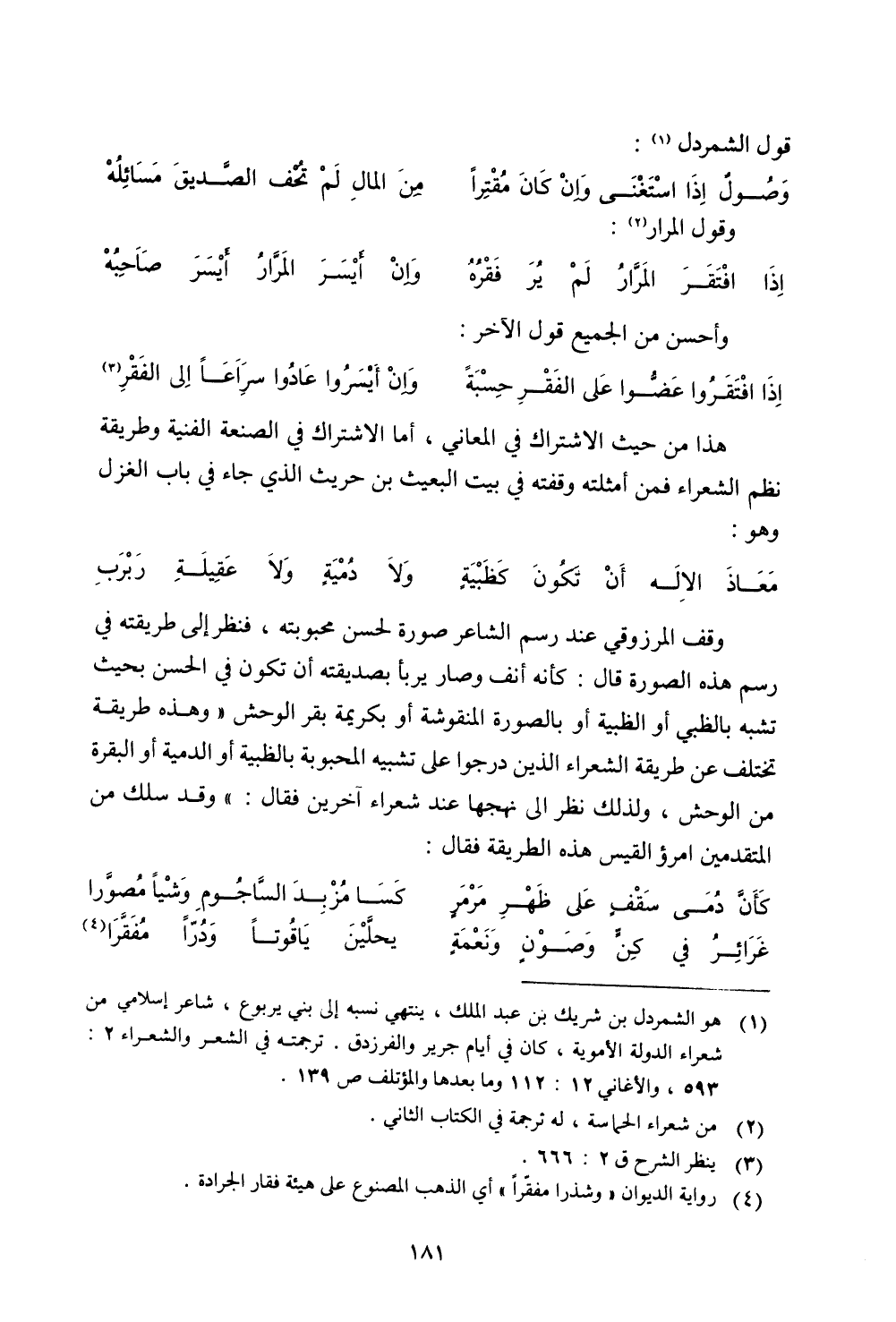 هذا من حيث الاشتراك في المعاني، أما الاشتراك في الصنعة الفنية وطريقة نظم الشعراء فمن أمثلته وقفته في بيت البعيث بن حريث الذي جاء في باب الغزل وهو: