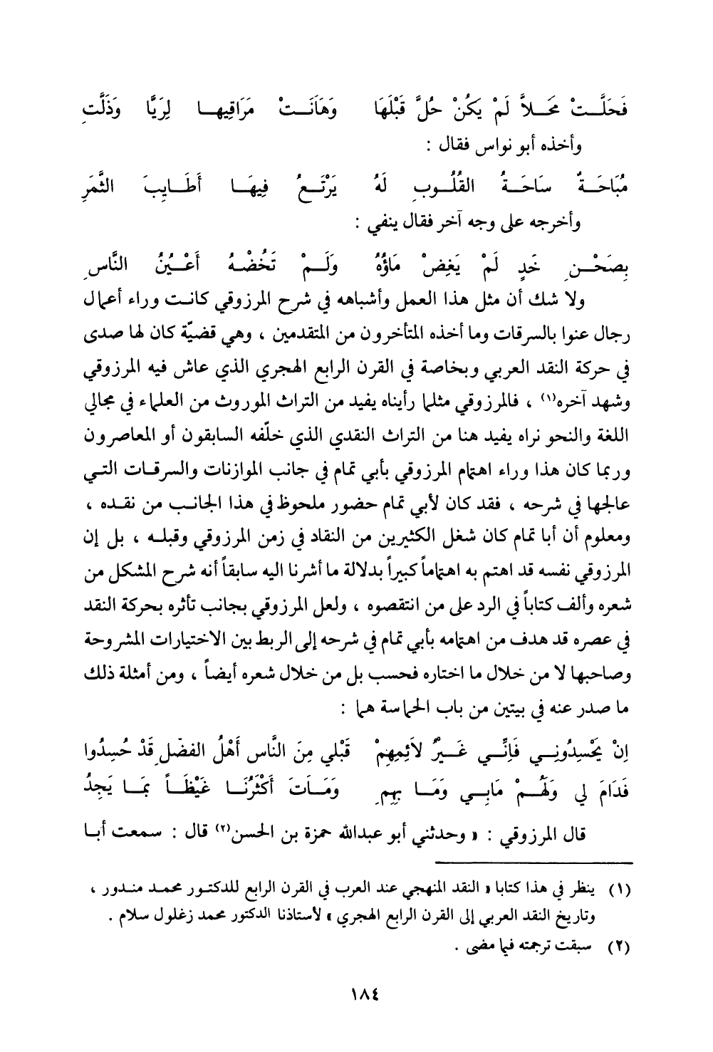 ولا شك أن مثل هذا العمل وأشباهه في شرح المرزوقي كانت وراء أعمال رجال عنوا بالسرقات وما أخذه المتأخرون من المتقدمين، وهي قضية كان لها صدى في حركة النقد العربي وبخاصة في القرن الرابع الهجري الذي عاش فيه المرزوقي وشهد آخره، فالمرزوقي مثلما رأيناه يفيد من التراث الموروث من العلماء في مجالي اللغة والنحو نراه يفيد هنا من التراث النقدي الذي خلفه السابقون أو المعاصرون وربما كان هذا وراء اهتمام المرزوقي بأبي تمام في جانب الموازنات والسرقات التي عالجها في شرحه، فقد كان لأبي تمام حضور ملحوظ في هذا الجانب من نقده، ومعلوم أ، أبا تمام كان شغل الكثيرين من النقاد في زمن المرزوقي وقبله، بل إن المرزوقي نفسه قد اهتم به اهتمامًا كبيرًا بدلالة ما أشرنا إليه سابقًا أنه شرح المشكل من شعر وألف كتابًا في الرد على من انتقصوه، ولعل المرزوقي بجانب تأثره بحركة النقد في عصره قد هدف من اهتمامه بأبي تمام في شرحه إلى الربط بين الاختيارات المشروحة وصاحبها لا من خلال ما اختاره فحسب بل من خلال شعره أيضًا، ومن أمثلة ذلك ما صدر عنه في بيتين من باب الحماسة هما: