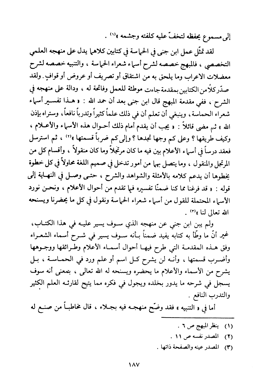 لقد تمثل عمل ابن جني في الحماسة في كتابين كلاهما يدل على منهجه العلمي التخصصي، فالمبهج خصصه لشرح أسماء الحماسة، والتنبيه خصصه لشرح معضلات الإعراب وما يلحق به من اشتقاق أو تصريف أو عروض أو قواٍف. ولقد صدر كلًا من الكتابين بمقدمة جاءت موطئه للعمل وفاتحة له، ودالة على منهجه في الشرح، ففي مقدمة المبهج قال ابن جني بعد أ، حمد الله: ((هذا تفسير أسماء شعراء الحماسة، وينبغي أ، تعلم أن في ذلك علمًا كثيرًا وتدربًا نافعًا، وستراه بإذن الله)) ثم مضى قائلًا: ((يجب أن يقدم أمام ذلك أحوال هذه الأسماء والأعلام، وكيف طريقها؟ وعلى كم وجها نجدها؟ وإلى كم ضربًا قسمتها))، ثم استرسل فعقد درسًا في أسماء الأعلام بين فيه ما كان مرتجلًا وما كان منقولًا، وأقسام كل من المرتجل والمنقول، وما يتصل بهما من أمور تدخل في صميم اللغة محاولًا في كل خطوة يخطوها أن يدعم كلامه بالأمثلة والشواهد والشرح، حتى وصل في النهاية إلى قوله: ((قد فرغنا مما كنا ضمنا تفسيره فيما تقدم من أحوال الأعلام، ونحن نورد الأسماء المحتملة للقول من أسماء شعراء الحماسة ونقول في كل ما يحضرنا ويسنحه الله تعالى لنا)).