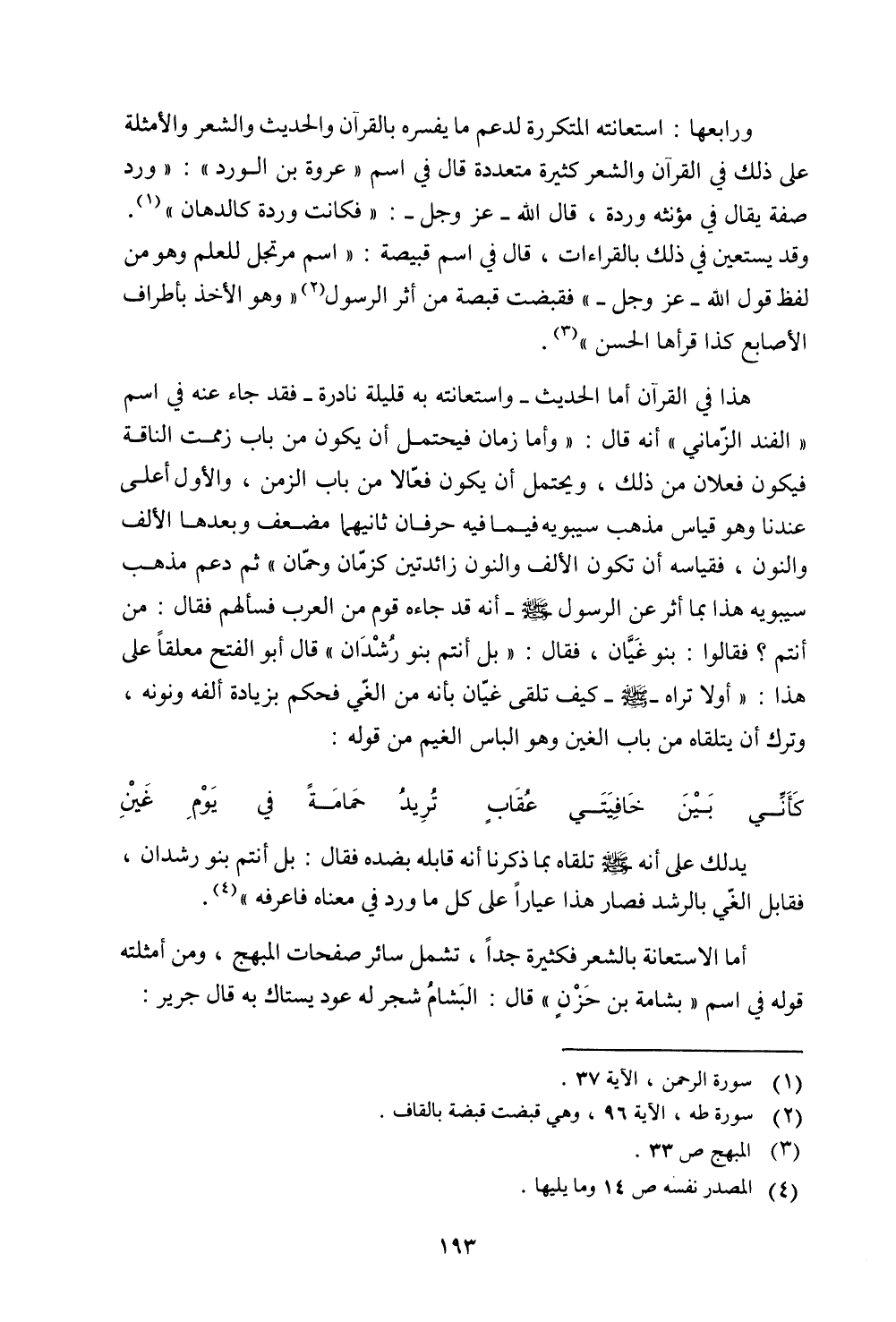 ورابعها: استعانته المتكررة لدعم يفسره بالقرآن والحديث والشعر والأمثلة على ذلك في القرآن والشعر كثيرة متعددة قال في اسم ((عروة بن الورد)): ((ورد صفة يقال في مؤنثه وردة، قال الله -عز وجل-: {فَكَانَتْ وَرْدَةً كَالدِّهَانِ}. وقد يستعين في ذلك بالقراءات، قال في اسم قبيصة: ((اسم مرتجل للعلم وهو من لفظ قول الله -عز وجل-)) فقبضت قبضة من أثر الرسول ((وهو الأخذ بأطراف الأصابع كذا قراها الحسن)).