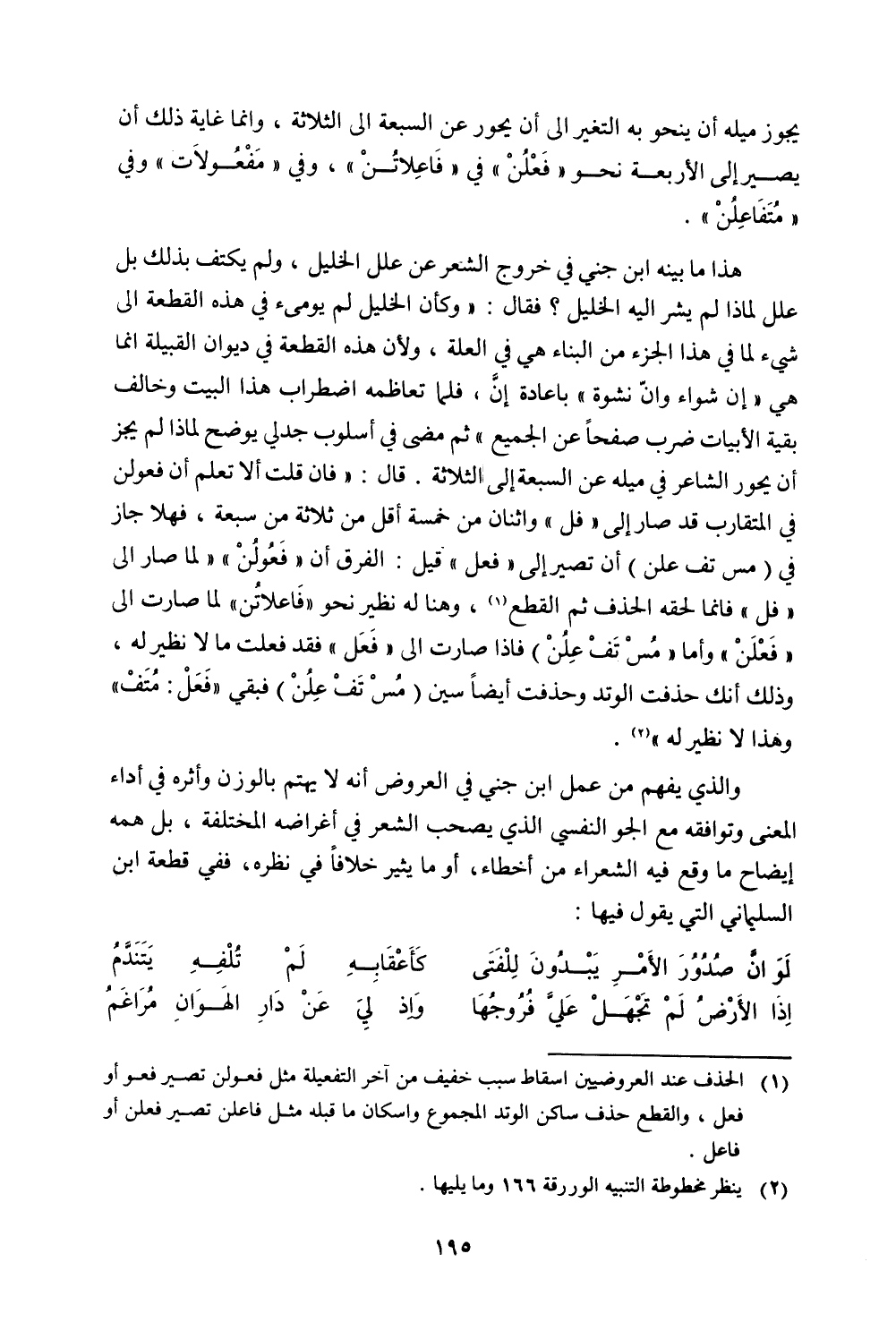 هذا ما بينه ابن جني في خروج الشعر عن علل الخليل، ولم يكتف بذلك بل علل لماذا لم يشر إليه الخليل؟ فقال: ((وكأن الخليل لم يومئ في هذه القطعة على شيء لما في هذا الجزء من البناء هي في العلة، ولأن هذه القطعة في ديوان القبيلة إنما هي ((إن شواء وان نشوة)) بإعادة إن، فلما تعاظمه اضطراب هذا البيت وخالف بقية الأبيات ضرب صفحًا عن الجميع)) ثم مضى في أسلوب جدلي يوضح لماذا لم يجز أن يحور الشاعر في ميله عن السبعة إلى الثلاثة. قال: ((فان قلت ألا تعلم أن فعولن في المتقارب قد صار إلى ((فل)) واثنان من خمسة أقل من ثلاثة من سبعة، فهلا جاز في (مس تف علن) أن تصير إلى ((فعل)) قيل: الفرق أن ((فعولن)) ((لما صار إلى ((فل)) فإنما لحقه الحذف ثم القطع، وهنا له نظير نحو ((فاعلاتن)) لما صارت إلى ((فعلن)) وأما ((مس تف علن)) فإذا صارت إلى ((فعل)) فقد فعلت ما لا نظير له، وذلك أنك حذفت الوتد وحذفت أيضًا سين (مس تف علن) فبقي ((فعل: متف)) وهذا لا نظير له)).