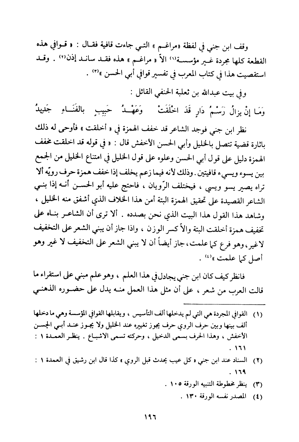 نظر ابن جني فوجد الشاعر قد خفف الهمزة في ((أخلقت)) فأوحى له ذلك بإثارة قضية تتصل بالخليل وأبي الحسن الأخفش قال: ((في قوله قد اختلقت مخفف الهمزة دليل على قول أبي الحسن وعلوه على قول الخليل في امتناع الخليل من الجمع بين يسؤ ويسيء قافيتين. وذلك لأنه فيما زعم يخلف إذا خفف همزة حرف رويه ألا تراه يصير يسو ويسى، فيختلف الرويان، فاحتج عليه أبو الحسن أنه إذا بني الشاعر القصيدة على تحقيق الهمزة البتة أمن هذا الخلاف الذي أشفق منه الخليل، وشاهد هذا القول هذا البيت الذي نحن بصدده. ألا ترى أن الشاعر بناه على تخفيف همزة أخلقت البتة وإلا كسر الوزن، وإذا جاز أن يبني الشعر على التخفيف لا غير، وهو فرع كما علمت، جاز أيضًا أن لا يبني الشعر على التخفيف لا غير وهو أصل كما علمت)).