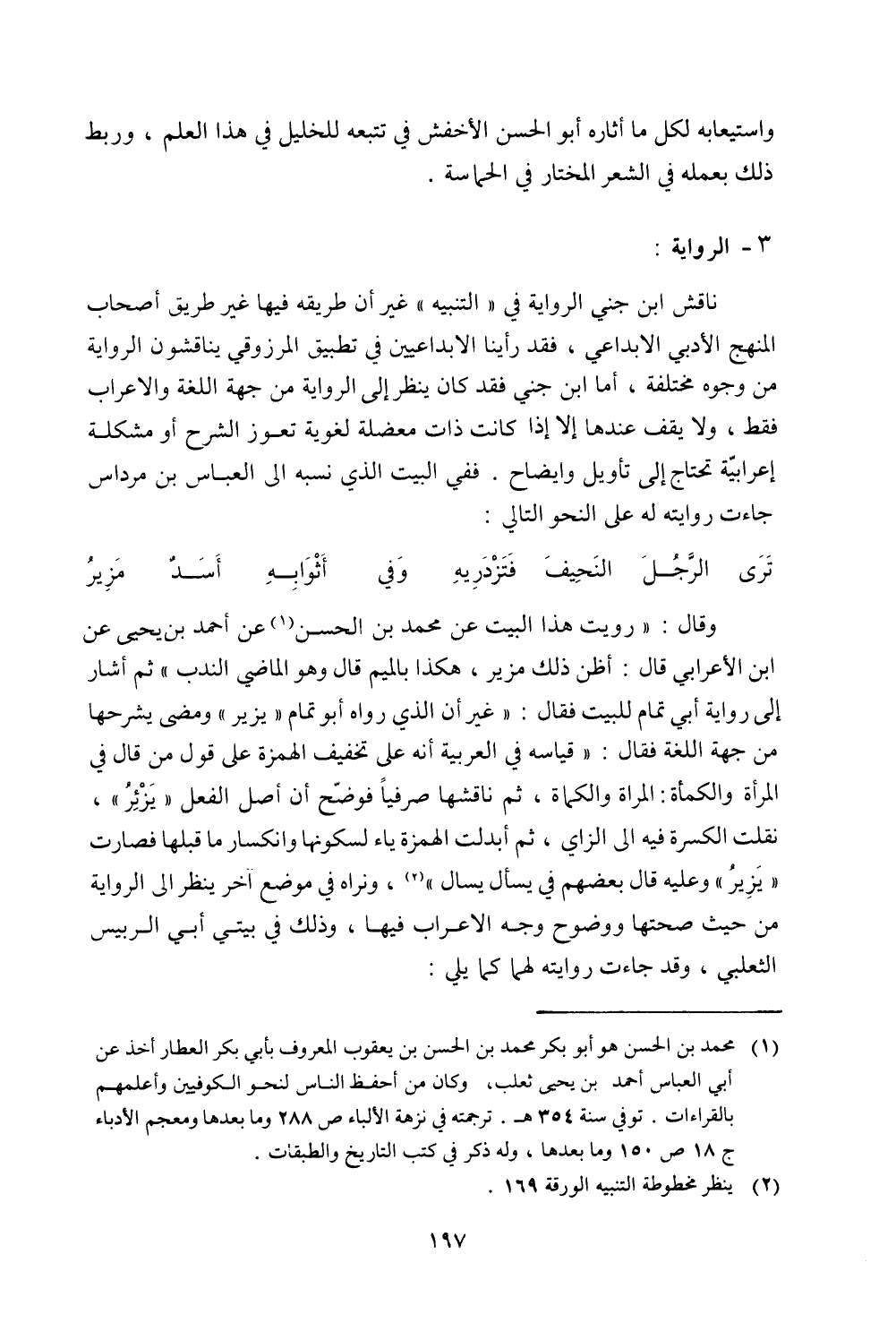 وقال: ((رويت هذا البيت عن محمد بن الحسن عن أحمد بن يحيى عن ابن الأعرابي قال: أظن ذلك مزير، هكذا بالميم قال وهو الماضي الندب)) ثم أشار لى رواية أبي تمام للبيت فقال: ((غير أن الذي رواه أبو تمام ((يزير)) ومضى يشرحها من جهة اللغة فقال: ((قياسه في العربية أنه على تخفيف الهمزة على قول من قال في المرأة والكمأة: المرأة والكماة، ثم ناقشها صرفيًا فوضح أن أصل الفعل ((يزئر))، نقلت الكرة فيه إلى الزاي، ثم أبدت الهمزة ياء لسكونها وانكسار ما قبلها فصارت ((يزير)) وعليه قال بعضهم في يسأل يسال))، ونراه في موضع آخر ينظر الى الرواية من حيث صحتها ووضوح وجه الإعراب فيها، وذلك في بيتي أبي الربيس الثعلبي، وقد جاءت روايته لهما كما يلي: