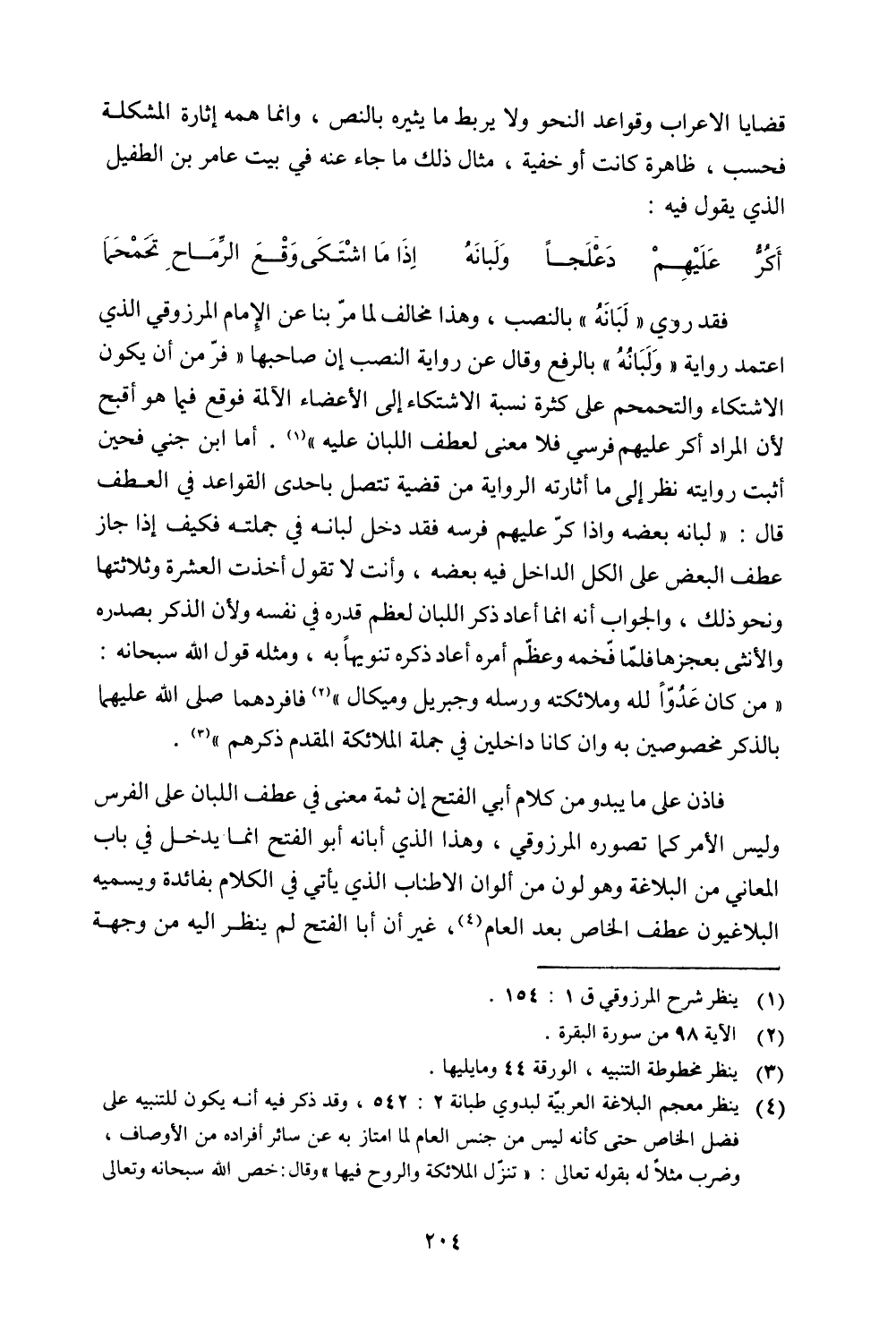 فأذن علي ما يبدو من كلام أبي الفتح إن ثمة معني في عطف اللبان علي الفرس وليس الأمر كما تصوره المرزوقي، وهذا الذي أبنه أبو الفتح إنما يدخل في باب المعاني من البلاغة وهو لون من ألوان الأطناب الذي يأتي في الكلام بقائدة ويسميه البلاغيون عطف الخاص بعد العام، غير أن أبا الفتح لم ينظر إليه من وجهة