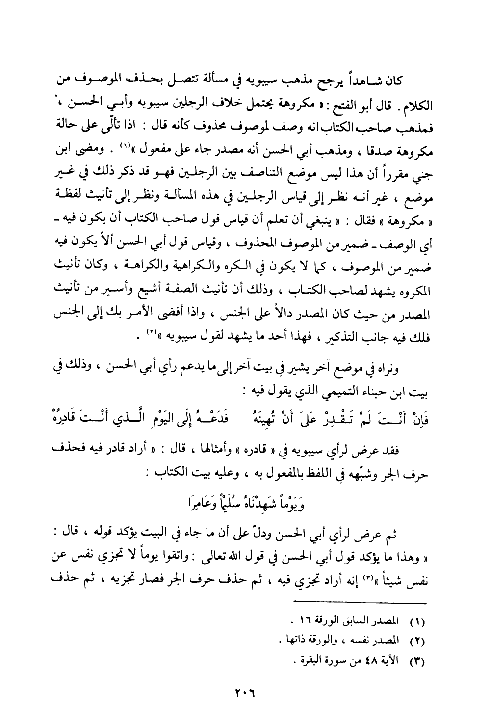 كان شاهداً يرجح مذهب سيبويه في مسألة تتصل بحذف الموصوف من الكلام. قال أبو الفتح: "مكروهة يحتمل خلاف الرجلين سيبويه وأبي الحسن، فمذهب صاحب الكتاب أنه وصف لموصوف محذوف كأنه قال: إذا تألي علي حالة مكروهة صدقاً، ومذهب أبي الحسن أنه مصدر جاء علي مفعول". ومضي ابن جنبي مقرراً أن هذا ليس موضع التناصف بين الرجلين فهو قد ذكر ذلك في غير موضع، غير أنه نظر إلي قياس الرجلين في هذه المسألة ونظر إلي تأنيث لفظة "مكروهة" فقال: "ينبغي أن تعلم أن قياس قول صاحب الكتاب أن يكون فيه- أي الوصف- ضمير من الموصوف لمحذوف، وقياس قول أبي الحسن ألا يكون فيه ضمير من الموصوف، كما لا يكون في الكره والكراهية والكراهة، وكأن تأنيث المكروه يشهد لصاحب الكتاب، وذلك أن تأنيث الصفة أشيع ,أسير من تأنيث المكروه يشهد لصاحب الكتاب، وذلك أن تأنيث الصفة أشيع وأسير من تأنيث المصدر من حيث كان المصدر دالاً علي الجنس، وإذا أفضي الأمر بك إلي الجنس فلك فيه جانب التذكير، فهذا أحد ما يشهد لقول سيبويه".