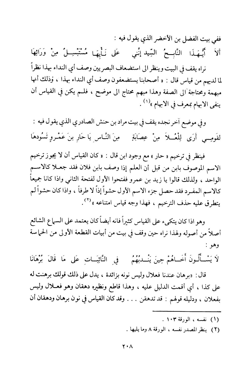 وهو إذا كان يتكئ علي القياس كثيراً فأنه أيضاً كان يعتمد علي السماع الشائع أصلاً من أصوله ولهذا نراه حين وقف في بيت من أبيات القطعة الأولي من الحماسة وهو: