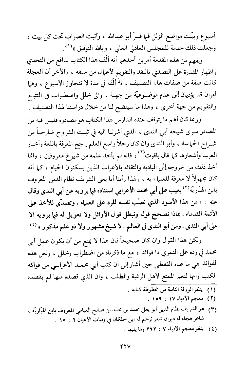 ونفهم من هذه المقدمة أمرين أحدهما أنه ألف هذا الكتاب بدافع من التحدي وإظهار المقدرة علي التصدي بالنقد والتقويم لأعمال من سبقه، والآخر أن العجلة كانت صفة من صفات هذا التصنيف، إذ ألفه في مدة لا تتجاوز الأسبوع، وهما أمران قد يديان إلي عدم موضوعية من جهة، وإلي خلل واضطراب في التتبع والتقويم من جهة أخري، وهذا ما سيتضح لنا من خلال دراستنا لهذا التصنيف. وربما كان أهم ما يتوقف عنده الدارس لهذا الكتاب هو مصادره فليس فيه من المصادر سوي شيخه أبي الندي، الذي أشرنا إليه في ثبت الشروح شارحًا من شراح الحماسة، وأبو الندي وان كان رجًلا واسع العلم راجع المعرفة باللغة وأخبار العرب وأشعارها كما قال ياقوت، فإنه لم يأخذ علمه من شيوخ معروفين، وإنما أخذ ذلك من خروجه إلي البادية والتقائه بالأعراف الذين يسكنون الخيام، كما أنه كان مجهوًلا لا معرفة للعلماء به، ولهذا رأينا أبا يعلي الشريف نظام الدين المعروف بابا الهبارية يعيب علي أبي محمد الأعرابي استناده فيما يرويه عن أبي الندي وقال عنه: "من هذا الأسود الذي نصب نفسه للرد علي العلماء، وتصدي للأخذ علي الأئمة القدماء، بماذا نصحح قوله ونبطل قول الأوائل ولا تعويل له فيما يرويه إلا علي أبي الندي، ومن أبو الندي في العالم، لا شيخ مشهور ولا ذو علم مذكور"