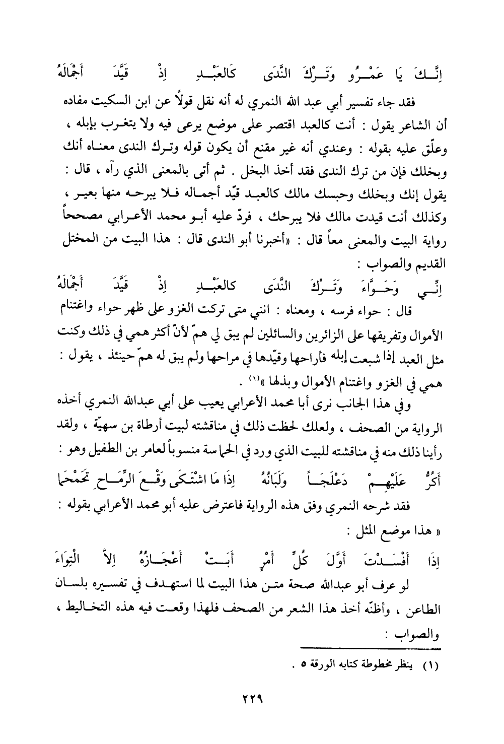 فقد جاء تفسير أبي عبد الله النمري له أنه نقل قولًا عن ابن السكيت مفاده أن الشاعر يقول: أنت كالعبد اقتصر على موضع يرعي فيه ولا يتغرب بإبله، وعلق عليه بقوله: وعندي أنه غير مقنع أن يكون قوله وترك الندى معناه أنك وبخلك فإن من ترك الندى فقد أخذ البخل. ثم أتي بالمعنى الذي رآه، قال: يقول إنك وبخلك وحبسك مالك كالعبد قيد أجماله فلا يبرحه منها بعير، وكذلك أنت قيدت مالك فلا يبرحك، فرد عليه أبو محمد الأعرابي مصححًا رواية البيت والمعنى معًا قال)) أخبرنا أبو الندي قال: هذا البيت من المختل القديم والصواب: