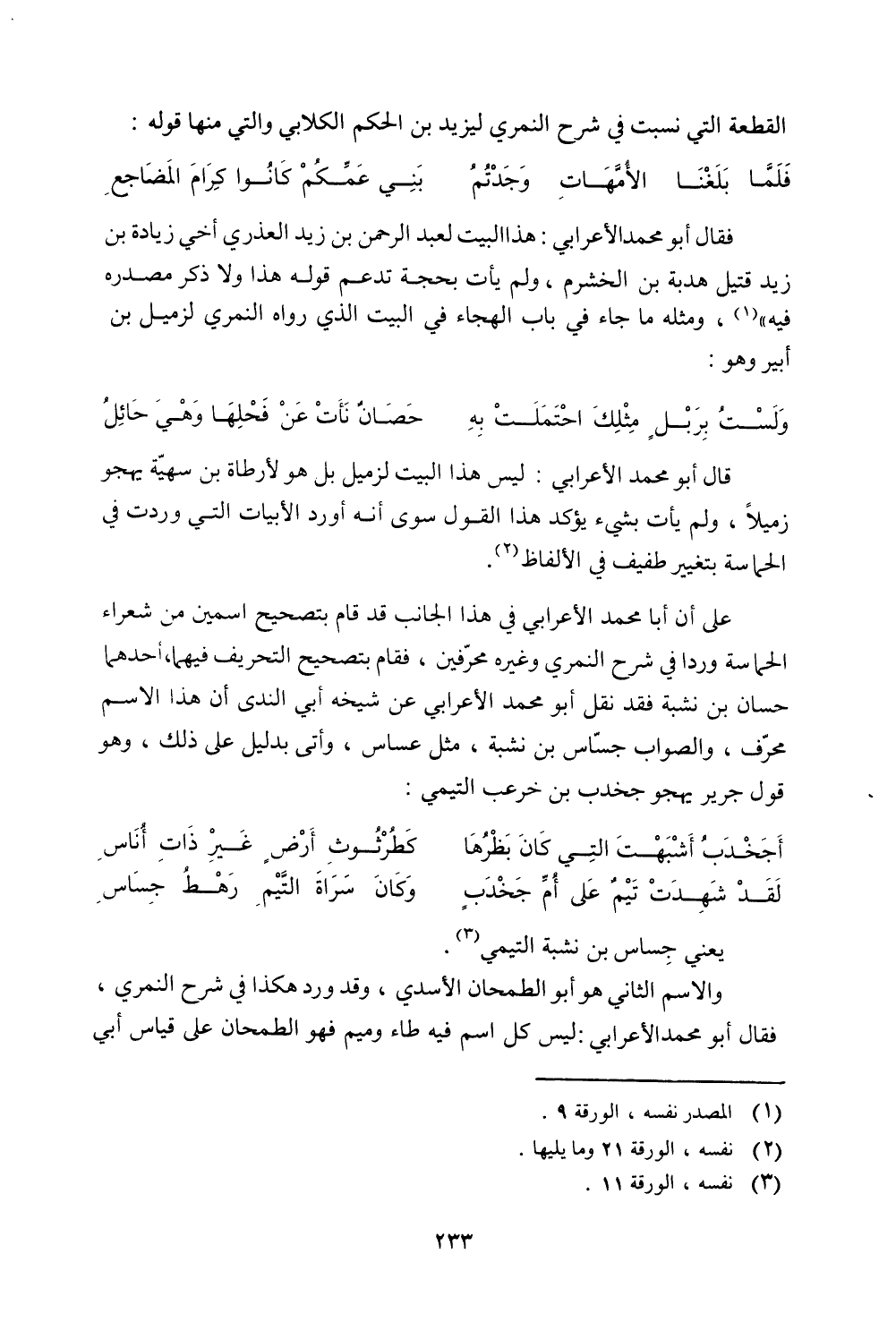 فقال أبو محمد الأعرابي: هذا البيت لعبد الرحمن بن زيد العذري أخي زيادة بن زيد قتيل هدبة بن الخشرم، ولم يأت بحجة تدعم قوله هذا ولا ذكره مصدره فيه"، ومثله ما جاء في باب الهجاء في البيت الذي رواه النمري لزميل بن أبير وهو: