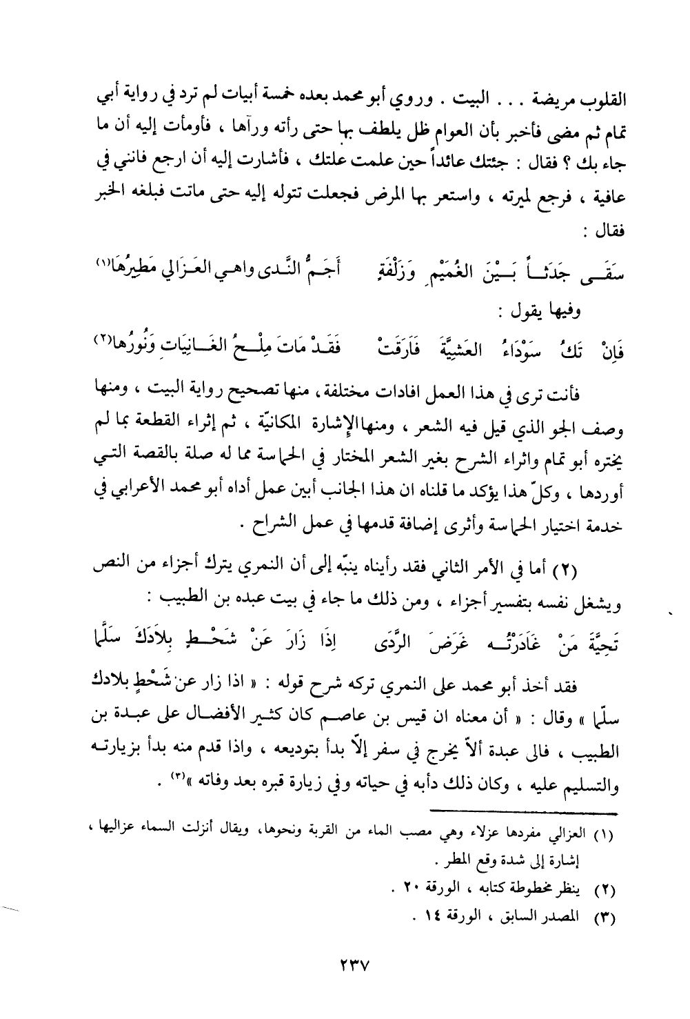 (2) أما في الأمر الثاني فقد رأيناه ينبه إلى أن النمري يترك أجزاء من النص ويشغل نفسه تفسير أجزاء، ومن ذلك ما جاء في بيت عبده بن الطيب: