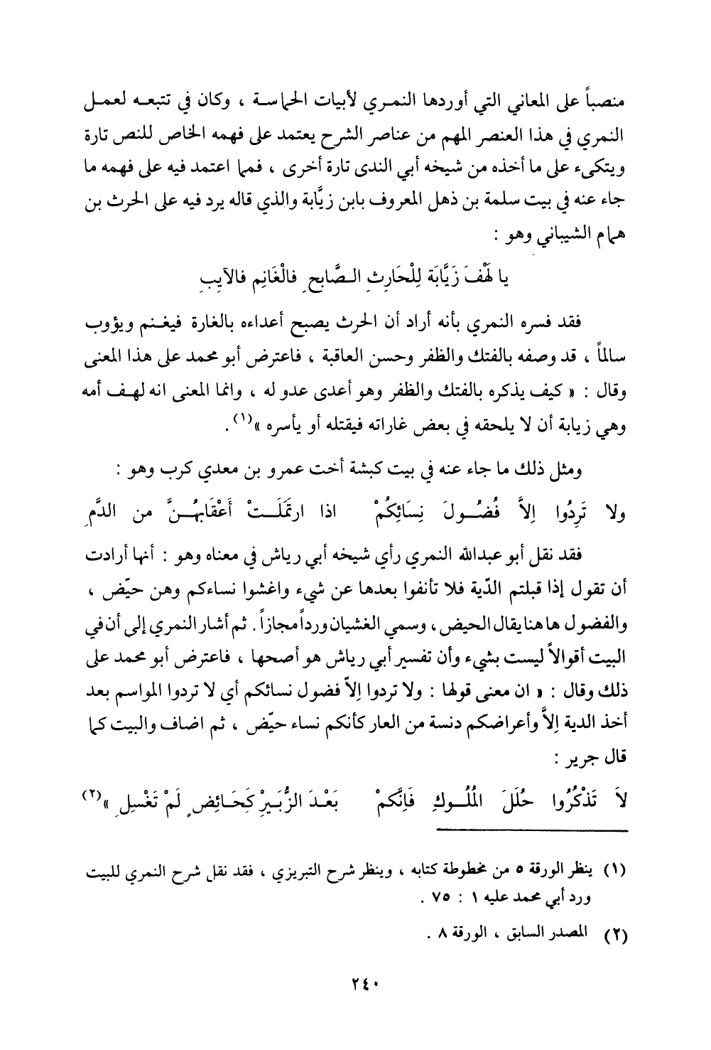 منصبًا على المعاني التي أوردها النمري لأبيات الحماسة، وكن في تتبعه لعمل النمري في هذا العنصر المهم من عناصر الشرح يعتمد علي فهمه الخاص للنص تارة ويتكئ علي ما أخذه من شيخه أبي الندي تارة أخري، فمما اعتمد فيه علي فهمه ما جاء عنه في بيت سلمة بن ذهل المعروف بابن زيابة والذي قاله يرد فيه علي الحرث بن همام الشيباني وهو: