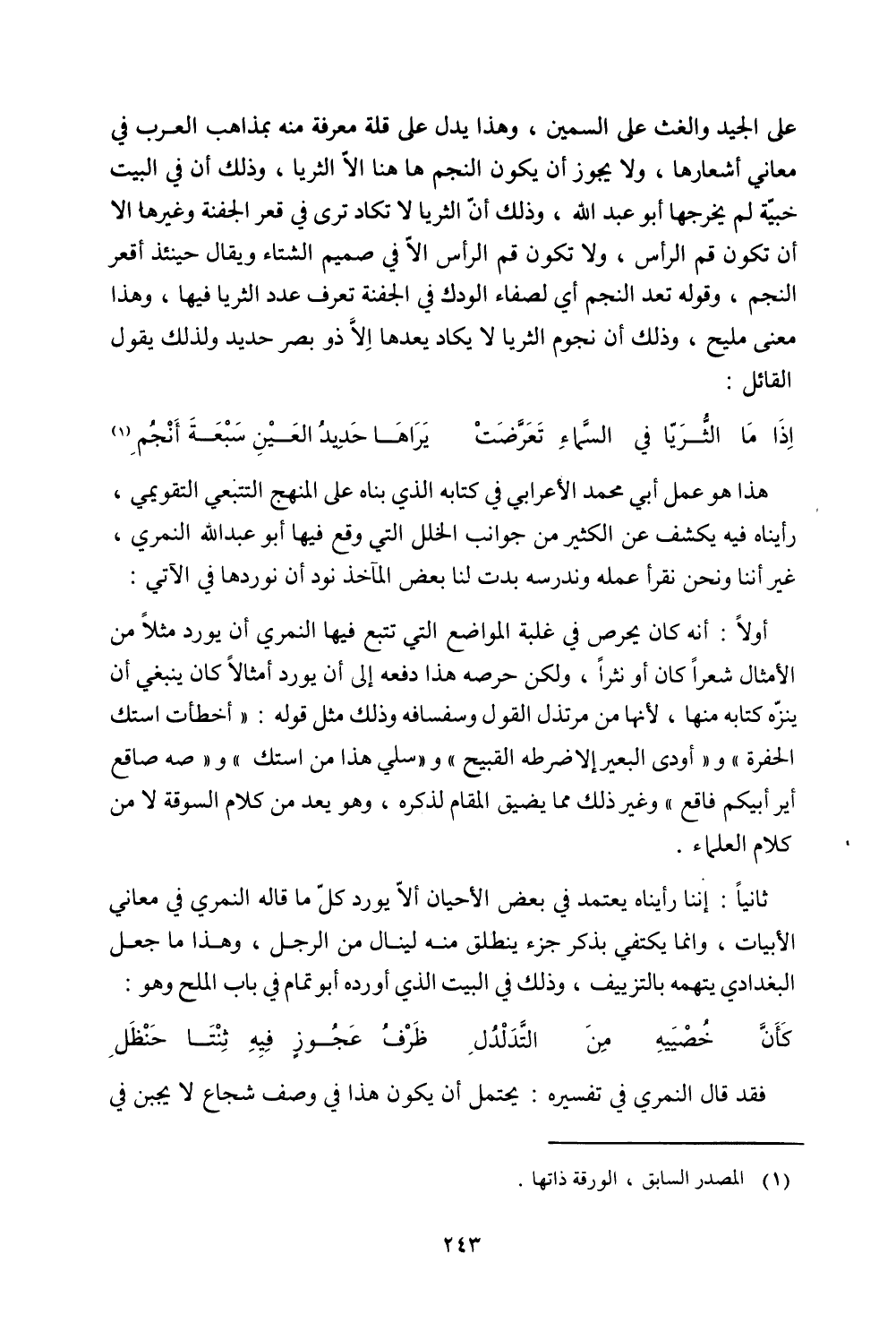 على الجيد والغث علي السمين، وهذا يدل علي قلة معرفة منه بمذاهب العرب في معاني أشعارها، ولا يجوز أن يكون النجم ها هنا إلا الثريا، وذلك أن في البيت خبية لم يخرجها أبو عبد الله، وذلك أن الثريا لا تكاد تري في قعر الجفنة وغيرها إلا أن تكون قم ارأس، ولا تكون قم الرأس إلا في صميم الشتاء ويقال حينئذ أقعر النجم، وقوله تعد النجم أي لصفاء الودك في الجفنة تعرف عدد الثريا فيها، وهذا معني مليح، وذلك أن نجوم الثريا لا يكاد يعدها إلا ذو بصر حديد ولذلك يقول القائل: