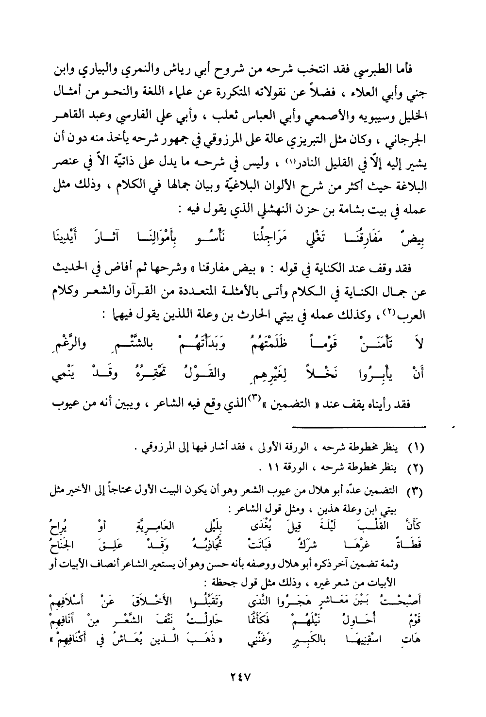 فأما الطبرسي فقد انتخب شرحه من شروح أبي رياش والنمري والبياري وابن جني وأبي العلاء، فضًلا عن نقولاته المتكررة عن علماء اللغة والنحو من أمثال الخليل وسيبويه والأصمعي وأبي العباس ثعلب، وأبي علي الفارسي وعبد القاهر الجرجاني، وكان مثل التبريزي عالة علي المرزوقي في جمهور شرحه يأخذ منه دون أن يشير إلا في القليل النادر، وليس في شرحه ما يدل علي ذاتية إلا في عنصر البلاغة حيث أكثر من شرح الألوان البلاغية وبيان جمالها في الكلام، وذلك مثل عمله في بيت بشامه بن حزن النهشلي الذي يقول فيه:
