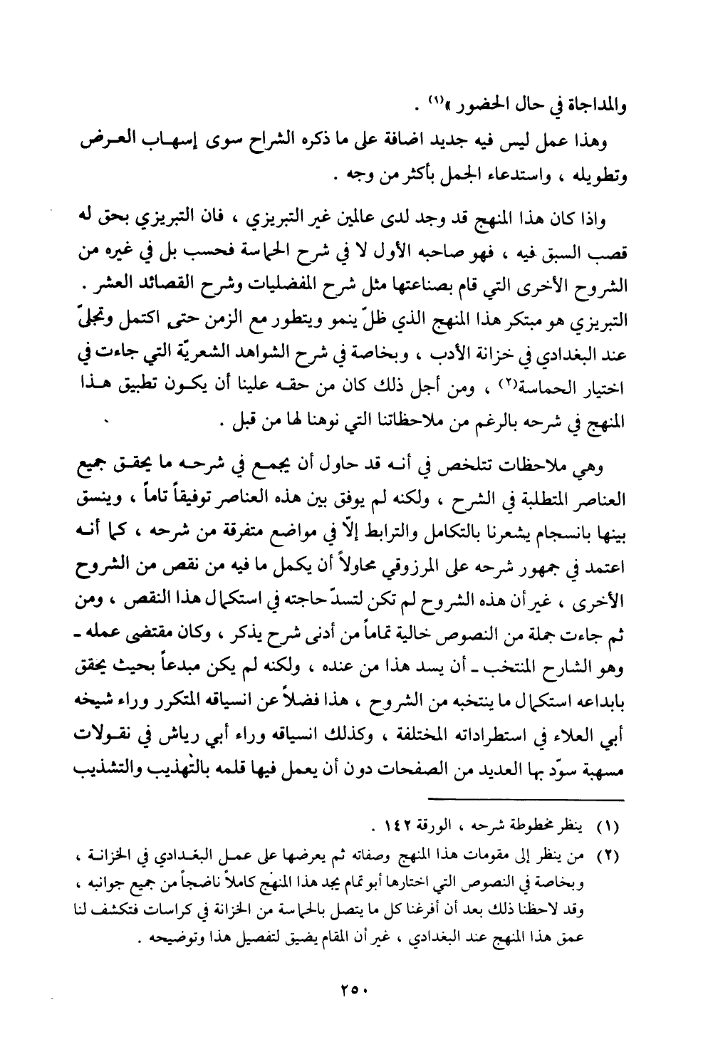وإذا كان هذا المنهج قد وجد لدى عالمين غير التبريزي، فإن التبريزي بحق له قصب السبق فيه، فهو صاحبه الأول لا في شرح الحماسة فحسب بل في غيره من الشروح الأخرى التي قام بصناعتها مثل شرح المفضليات وشرح القصائد العشر. التبريزي هو مبتكر هذا المنهج الذي ظل ينمو ويتطور مع الزمن حتى اكتمل وتجلى عند البغدادي في خزانة الأدب، وبخاصة في شرح الشواهد الشعرية التي جاءت في اختيار الحماسة، ومن أجل ذلك كان من حقه علينا أن يكون تطبيق هذا المنهج في شرحه بالرغم من ملاحظاتنا التي نوهنا لها من قبل.