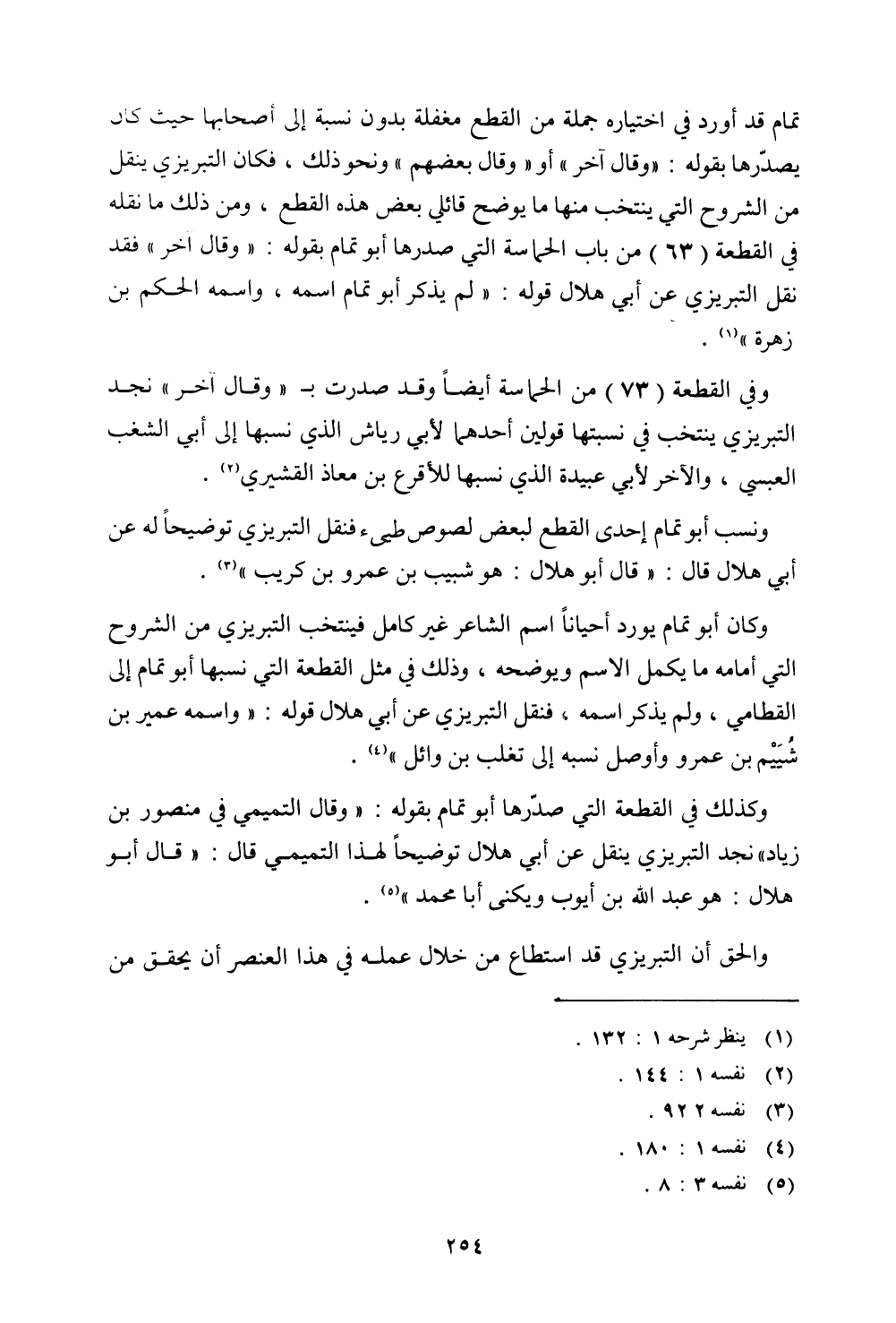 تمام قد أورد في اختياره جملة من القطع مغفلة بدون نسبة إلى أصحابها حيث كان يصدرها بقوله: "وقال آخر" أو "وقال بعضهم" ونحو ذلك، فكان التبريزي ينقل من الشروح التي ينتخب منها ما يوضح قائلي بعض هذه القطع، ومن ذلك ما نقله في القطيعة (63) من باب الحماسة التي صدرها أبو تمام بقوله: "وقال آخر" فقد نقل التبريزي عن أبي هلال قوله: "لم يذكر أبو تمام اسمه، واسمه الحكم بن زهرة".