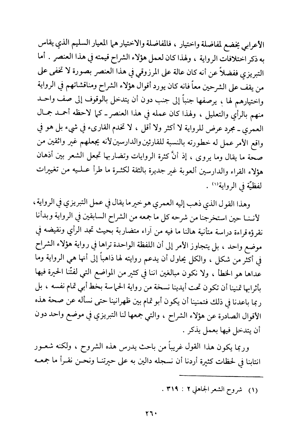 الأعرابي يخضع لمفاضلة واختيار، فالمفاضلة والاختيار هما المعيار السليم الذي يقاس به ذكر اختلافات الرواية، ولهذا كان لعمل هؤلاء الشراح قيمته في هذا العنصر. أما التبريزي ففضلًا عن أنه كان عالة على المرزوقي في هذا العنصر بصورة لا تخفى على من يقف على الشرحين معًا فإنه كان يورد أقوال هؤلاء الشراح ومناقشاتهم في الرواية واختيارهم لها، يرصفها جنبًا إلى جنب دون أن يتدخل بالوقوف إلى صف واحد منهم بالرأي والتعليل، ولهذا كان عمله في هذا العنصر- كما لاحظه أحمد جمال العمري- مجرد عرض للرواية لا أكثر ولا أقل، لا تخدم القارئ في شيء بل هو في واقع الأمر عمل له خطورته بالنسبة للقارئين والدارسين لأنه يجعلهم غير واثقين من صحة ما يقال وما يروي، إذ أن كثرة الروايات وتضاربها تجعل الشعر بين أذهان هؤلاء القراء والدراسيين ألعوبة غير جديرة بالثقة لكثرة ما طرأ عليه من تغييرات لفظية في الرواية.