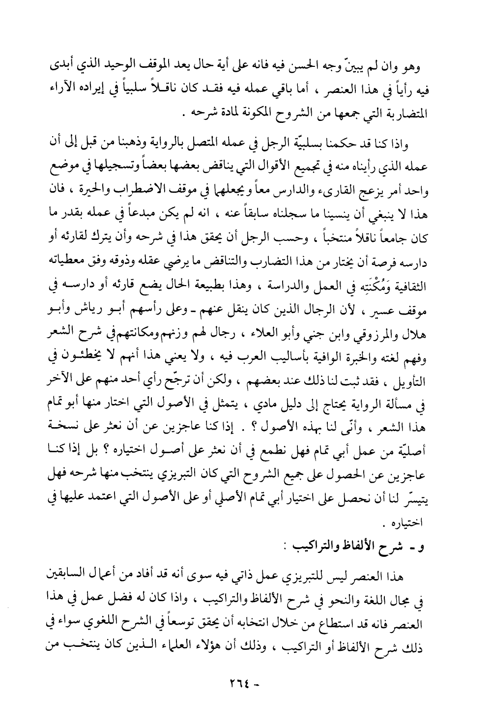 وإذا كنا قد حكمنا بسلبية الرجل في عمله المتصل بالرواية وذهبنا من قبل إلى أن عمله الذي رأيناه منه في تجميع الأقوال التي يناقض بعضها بعضًا وتسجيلها في موضع واحد أمر يزعج القارئ والدارس معًا ويجعلهما في موقف الاضطراب والحيرة، فإن هذا لا ينبغي أن ينسينا ما سجلناه سابقًا عنه، إنه لم يكن مبدعًا في عمله بقدر ما كان جامعًا ناقلًا منتخبًا، وحسب الرجل أن يحقق هذا في شرحه وأن يترك لقارئه أو دارسه فرصة أن يختار من هذا التضارب والتناقض ما يرضي عقله وذوقه وفق معطياته الثقافية ومكنته في العمل والدراسة، وهذا بطبيعة الحال يضع قارئه أو دارسه في موقف عسير، لأن الرجال الذين كان ينقل عنهم- وعلى رأسهم أبو رياش وأبو هلال والمرزوقي وابن جني وأبو العلاء، رجال لهم وزنهم ومكانتهم في شرح الشعر وفهم لغته والخبرة الوافية بأساليب العرب فيه، ولا يعني هذا أنهم لا يخطئون في التأويل، فقد ثبت لنا ذلك عند بعضهم، ولكن أن ترجح رأي أحد منهم على الآخر في مسألة الرواية يحتاج إلى دليل مادي، يتمثل في الأصول التي اختار منها أبو تمام هذا الشعر، وأني لنا بهذه الأصول؟ . إذا كنا عاجزين عن أن نعثر على نسخة أصلية من عمل أبي تمام فهل نطمع في أن نعثر على أصول اختياره؟ بل إذا كنا عاجزين عن الحصول على جميع الشروح التي كان التبريزي ينتخب منها شرحه فهل يتيسر لنا أن نحصل على اختيار أبي تمام الأصلي أو على الأصول التي اعتمد عليها في اختياره.