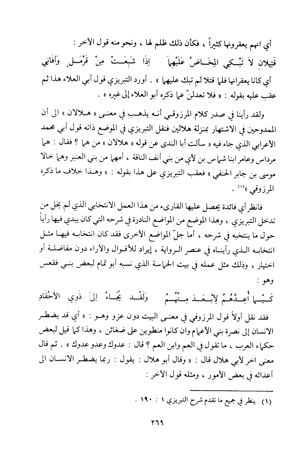 ولقد رأينا في صدر كلام المرزوقي أنه يذهب في معنى "هلالان" إلى أن الممدوحين في الاشتهار بمنزلة هلالين فنقل التبريزي في الموضع ذاته قول أبي محمد الأعرابي الذي جاء فيه "سألت أبا الندى عن قوله "هلالان" من هما؟ فقال: هما مرداس وعامر ابن شماس بن لأي من بني أنف الناقة، أمهما من بني العنبر وهما خالا موسى بن جابر الحنفي" فعقب التبريزي على هذا بقوله: "وهذا خلاف ما ذكره المرزوقي".