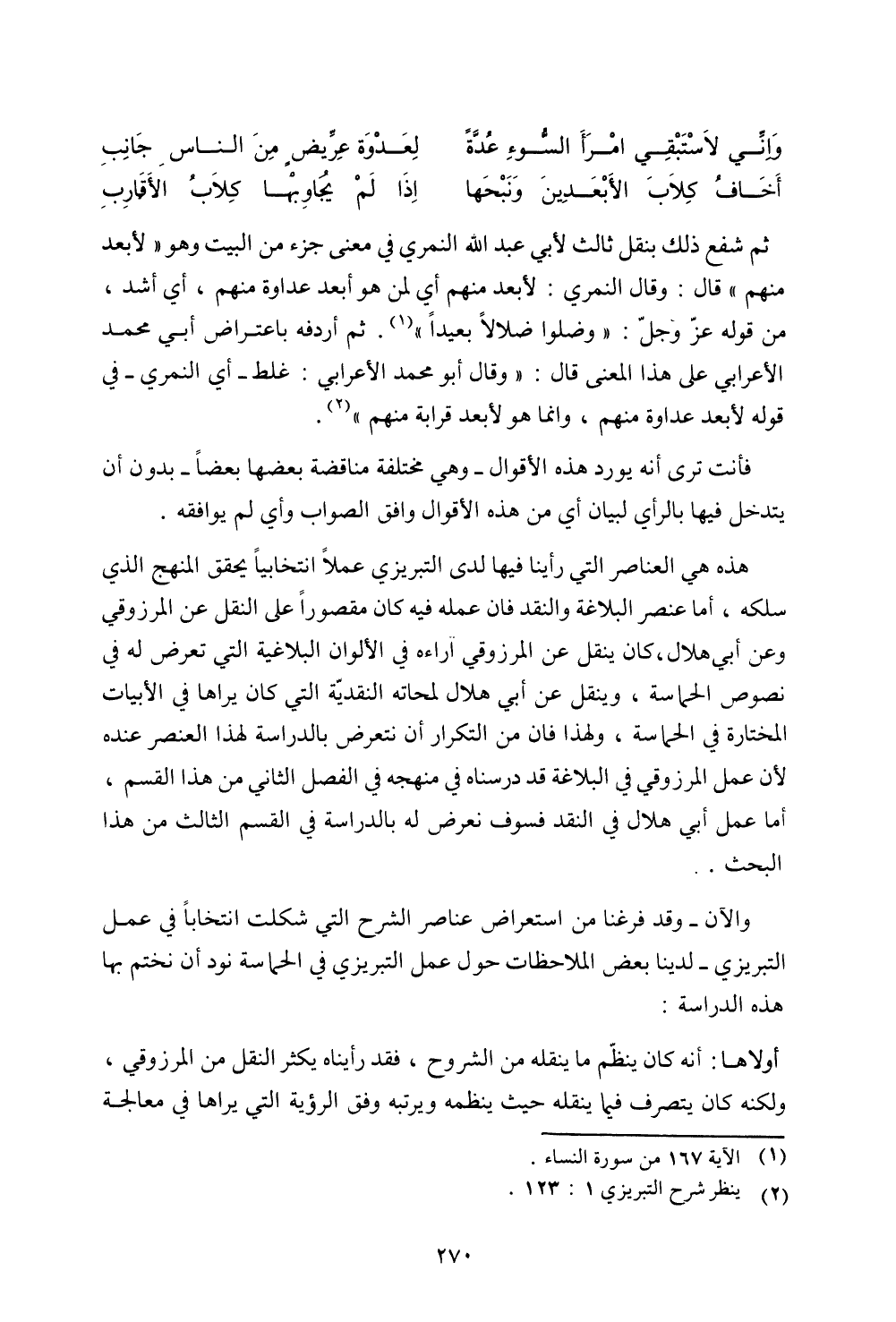 هذه هي العناصر التي رأينا فيها لدى التبريزي عملًا انتخابيًا يحقق المنهج الذي سلكه، أما عنصر البلاغة والنقد فإن عمله فيه كان مقصورًا على النقل عن المرزوقي وعن أبي هلال، كان ينقل عن المرزوقي آراءه في الألوان البلاغية التي تعرض له في نصوص الحماسة، وينقل عن أبي هلال لمحاته النقدية التي كان يراها في الأبيات المختارة في الحماسة، ولهذا فإن من التكرار أن نتعرض بالدراسة لهذا العنصر عنده لأن عمل المرزوقي في البلاغة قد درسناه في منهجه في الفصل الثاني من هذا القسم، أما عمل أبي هلال في النقد فسوف نعرض له بالدراسة في القسم الثالث من هذا البحث.