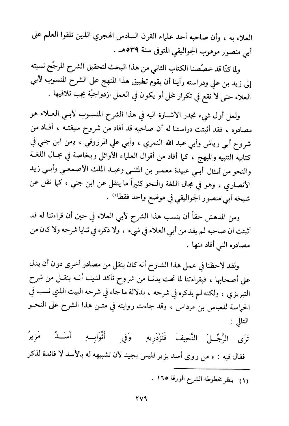 العلاء به، وأن صاحبه أحد علماء القرن السادس الهجري الذين تلقوا العلم على أبي منصور موهوب الجواليقي المتوفى سنة 539 هـ.