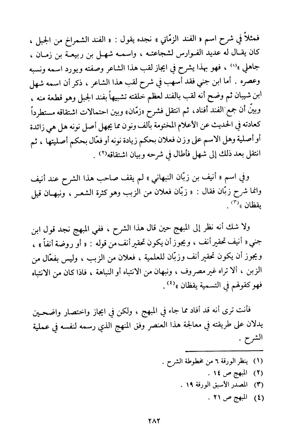 ولا شك أنه نظر إلى المبهج حين قال هذا الشرح، ففي المبهج نجد قول ابن جني "أنيف تحقير أنف، ويجوز أن يكون تحقير أنف من قوله: "أو روضة أنفًا"، ويجوز أن يكون تحقير أنف وزبان للعلمية، فعلان من الزبب، وليس بفعال من الزبن، ألا تراه غير مصروف، ونبهان من الانتباه أو النياهة، فإذا كان من الانتباه فهو كقولهم في التسمية يقظان".
