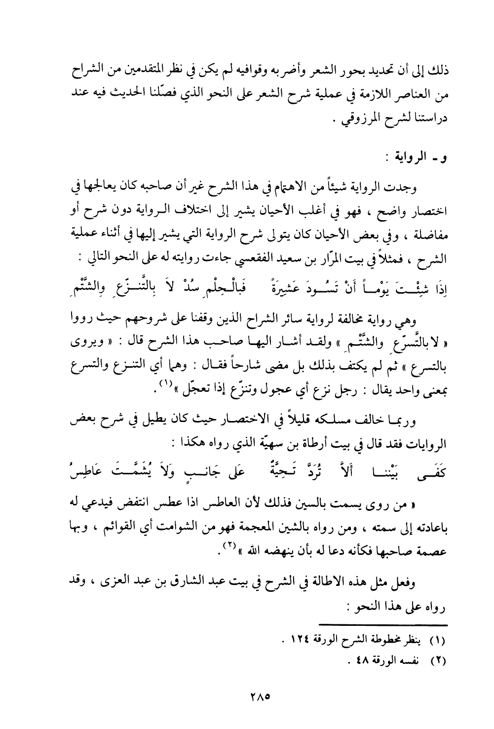 ذلك إلى أن تحديد بحور الشعر وأضربه وقوافيه لم يكن في نظر المتقدمين من الشراح من العناصر اللازمة في عملية شرح الشعر على النحو الذي فصلنا الحديث فيه عند دراستنا لشرح المرزوقي.