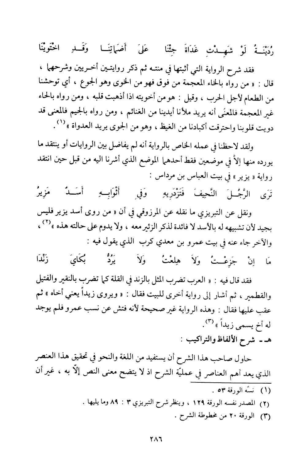 ولقد لاحظنا في عمله الخاص بالرواية أنه لم يفاضل بين الروايات أو ينتقد ما يورده منها إلا في موضعين فقط أحدهما الموضع الذي أشرنا إليه من قبل حين انتقد رواية "يزير" في بيت العباس بن مرداس: