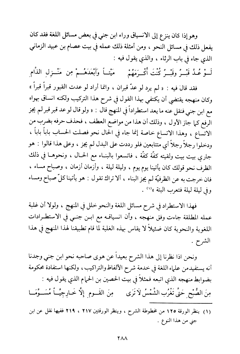 وهو إذا كان ينزع إلى الانسياق وراء ابن جني في بعض مسائل اللغة فقد كان يفعل ذلك في مسائلا لنحو، ومن أمثلة ذلك عمله في بيت عصام بن عبيد الزماني الذي جاء في باب الرثاء، والذي يقول فيه: