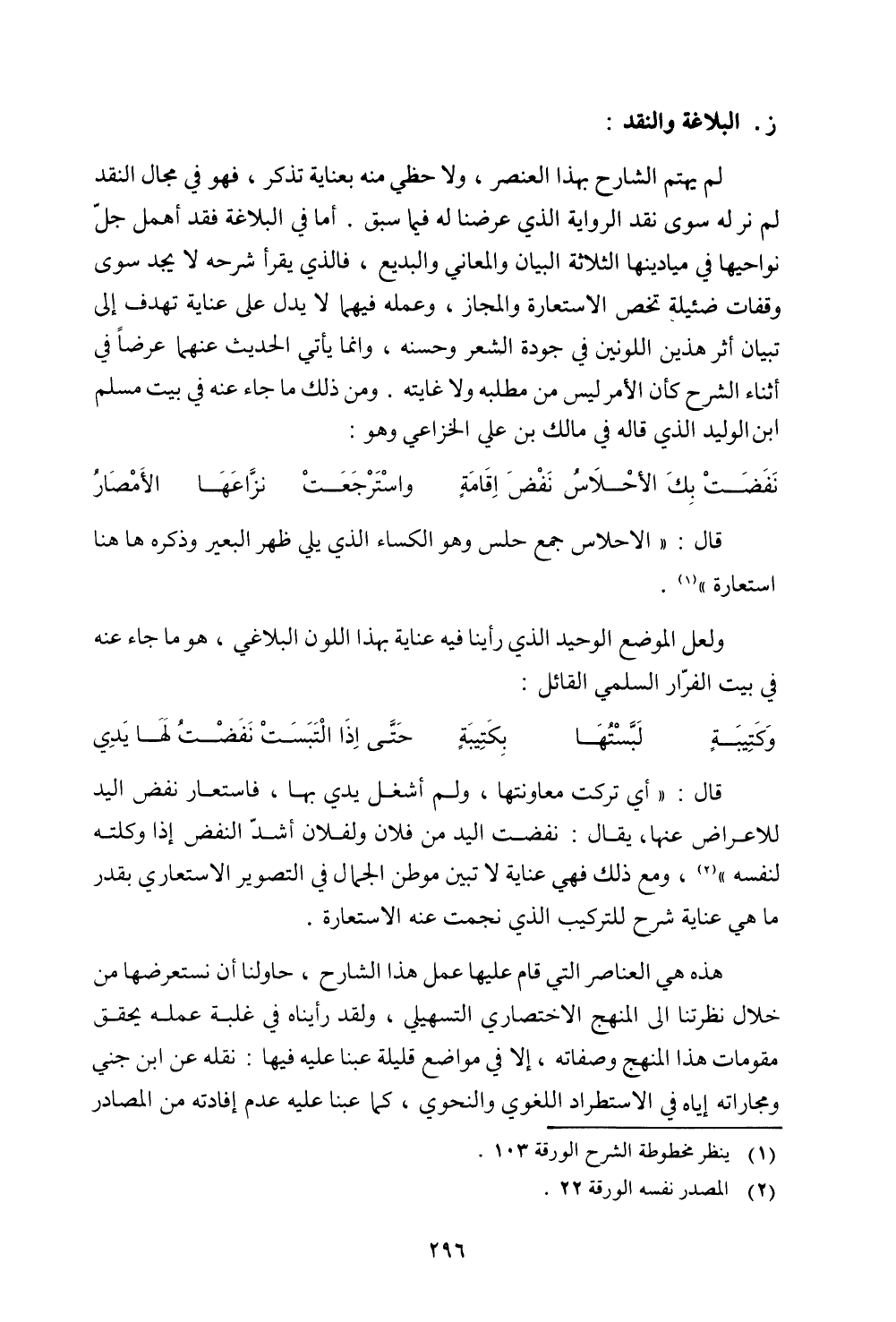 لم يهتم الشارح بهذا العنصر، ولا حظي منه بعناية تذكر، فهو في مجال النقد لم نر له سوى نقد الرواية الذي عرضنا له فيما سبق. أما في البلاغة فقد أهمل جل نواحيها في ميادينها الثلاثة البيان والمعاني والبديع، فالذي يقرأ شرحه لا يجد سوى وقفات ضئيلة تخص الاستعارة والمجاز، وعمله فيهما لا يدل على عناية تهدف إلى تبيان أثر هذين اللونين في جودة الشعر وحسنه، وإنما يأتي الحديث عنهما عرضًا في أثناء الشرح كأن الأمر ليس من مطلبه ولا غايته. ومن ذلك ما جاء عنه في بيت مسلم ابن الوليد الذي قاله في مالك بن علي على الخزاعي وهو: