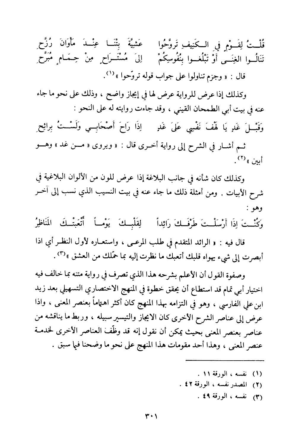 وصفوة القول أن الأعلم بشرحه هذا الذي تصرف في رواية متنه با خالف فيه اختيار أبي تمام قد استطاع أن يحقق خطوة في المنهج الاختصاري التسهيلي بعد زيد ابن علي الفارسي، وهو في التزامه بهذا المنهج كان أكثر اهتمامًا بعنصر المعنى، وإذا عرض إلى عناصر الشرح الأخرى كان الإيجاز والتيسير سبيله، وربط ما يناقشه من عناصر بعنصر المعنى بحيث يمكن أن نقول إنه قد وظف العناصر الأخرى لخدمة عنصر المعنى، وهذا أحد مقومات هذا المنهج على نحو ما وضحنا فيما سبق.