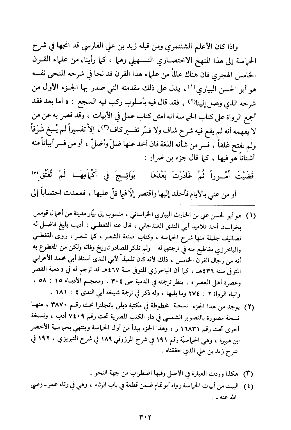 وإذا كان الأعلم الشنتمري ومن قبله زيد بن علي الفارسي قد اتجها في شرح الحماسة إلى هذا المنهج الاختصاري التسهيلي وهما، كما رأينا، من علماء القرن الخامس الهجري فإن هناك عالمًا من علماء هذا القرن قد نحا في شرحه المنحي نفسه هو أبو الحسن البياري، يدل على ذلك مقدمته التي صدر بها الجزء الأول من شرحه الذي وصل إلينا، فقد قال فيه بأسلوب ركب فيه السجع: "أما بعد فقد أجمع الرواة على كتاب الحماسة أنه أمثل كتاب عمل في الأبيات، وقد قصر به عن من لا يفهمه أنه لم يقع فيه شرح شاف ولا فسر تفسير كاف، إلا تفسيرًا لم يسغ شرقًا ولم يفتح غلقًا، فسر من شأنه اللغة فإن أخذ عنها ضل وأضل، أو من فسر أبياتًا منه أشتاتًا هو فيها، كما قال جزء بن ضرار:
